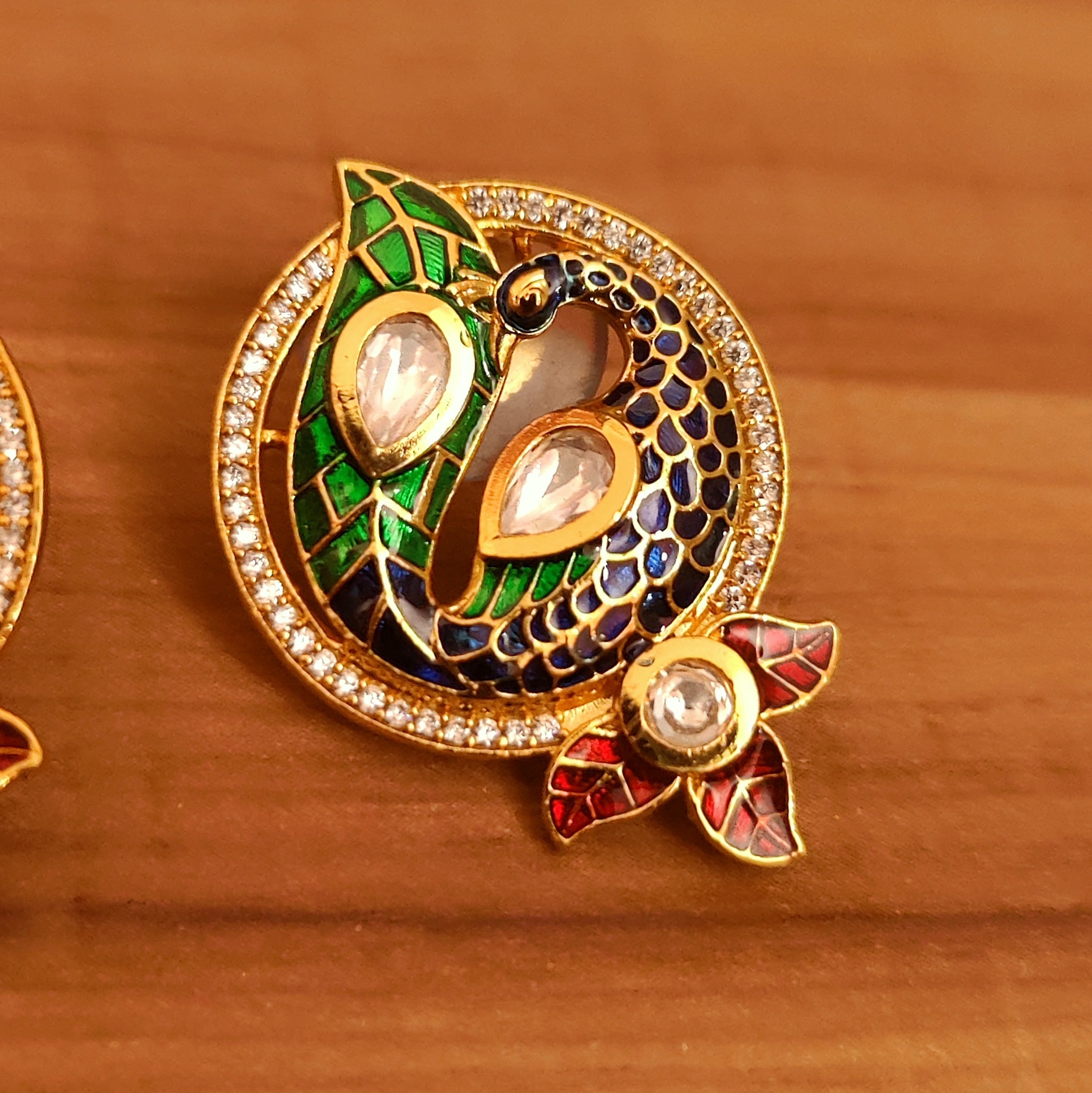 These beautiful peacock pattern studs are handcrafted in brass alloy with imitation cz stone and kundan with multi meenakari work of very fine quality. these artistic yet modern earrings are plated with high quality gold rhodium. the earrings are very light in weight.