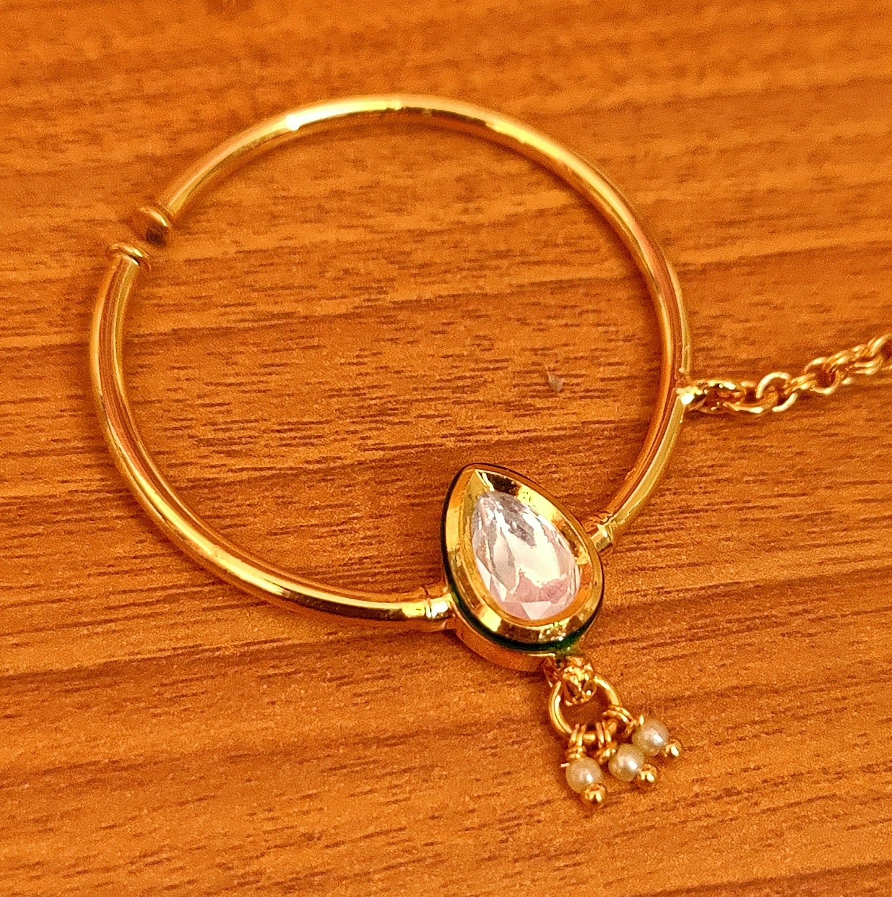 This beautiful nose ring is handcrafted in brass alloy with imitation kundan with meenakari work of very fine quality . this nose ring is coated with 18 kt gold polish which give it a real look . an absolutely stunning piece to own and is very light in weight.