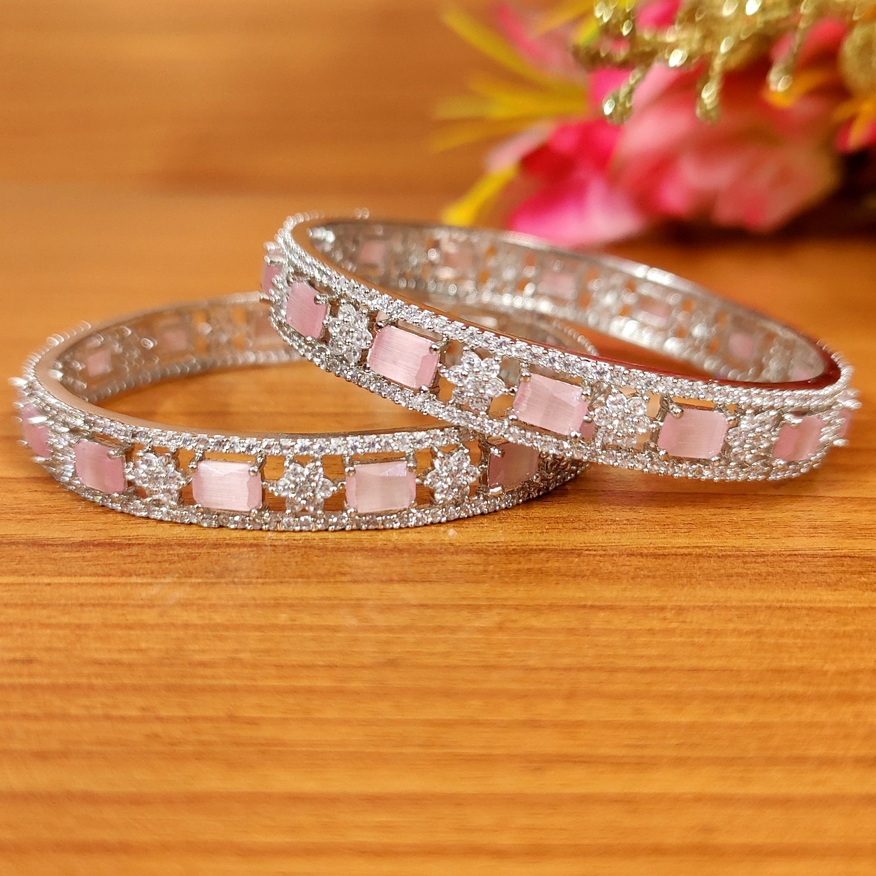 Add a soft touch of luxury to your collection with the Pink Onyx CZ Diamond Look Silver Bangles from Sanvi Jewels. These elegant bangles feature blush pink onyx-look cubic zirconia stones, designed to mimic diamond brilliance, set in a sleek silver-plated frame. Perfect for festive occasions, weddings, or elevating your everyday look, these bangles offer a graceful blend of charm and sophistication.