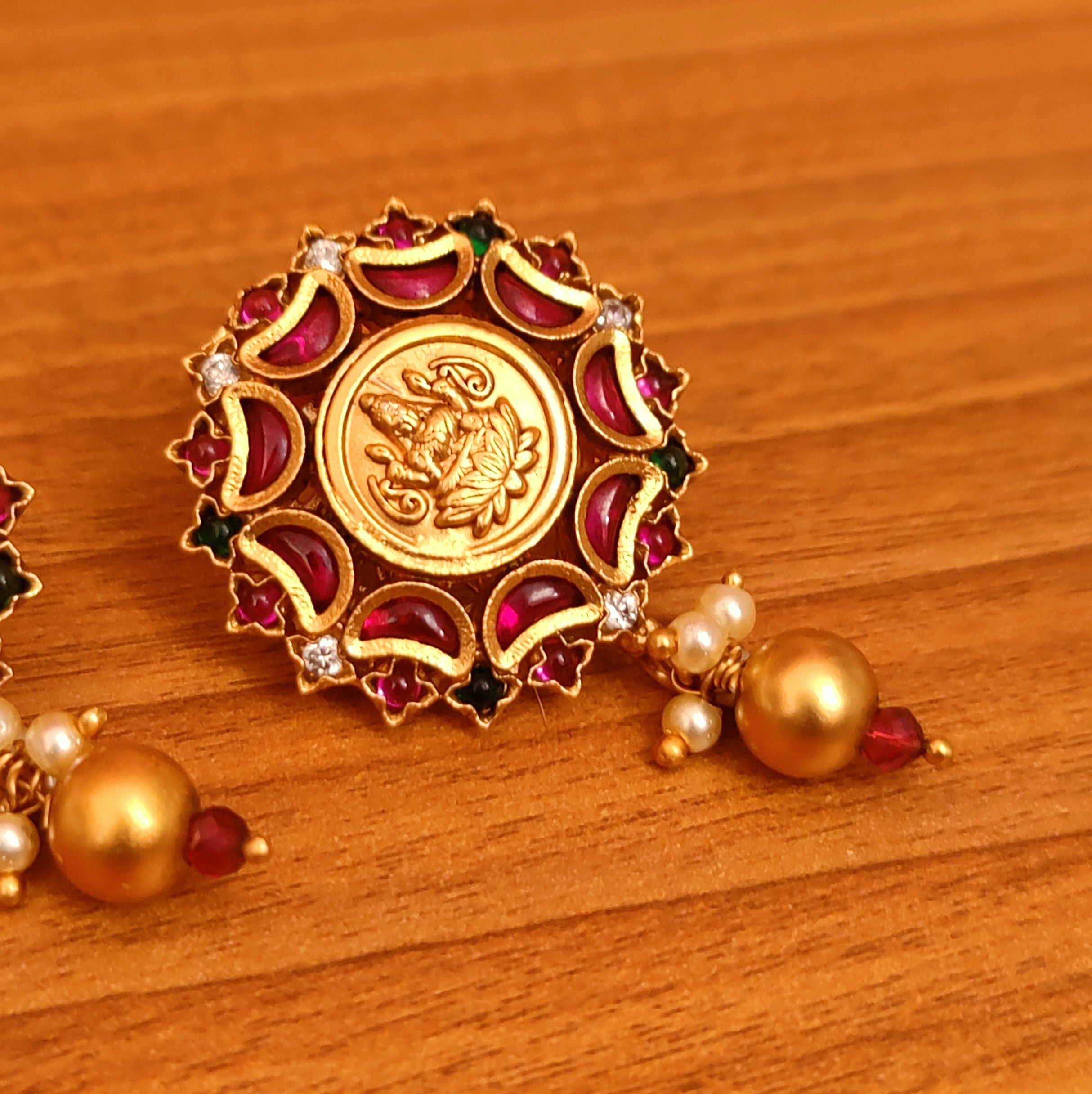 These temple look studs are handcrafted in copper alloy with imitation red & green colour stone and pearls of very fine quality. these artistic yet modern earrings are plated with high quality gold rhodium. the earrings are very light in weight.