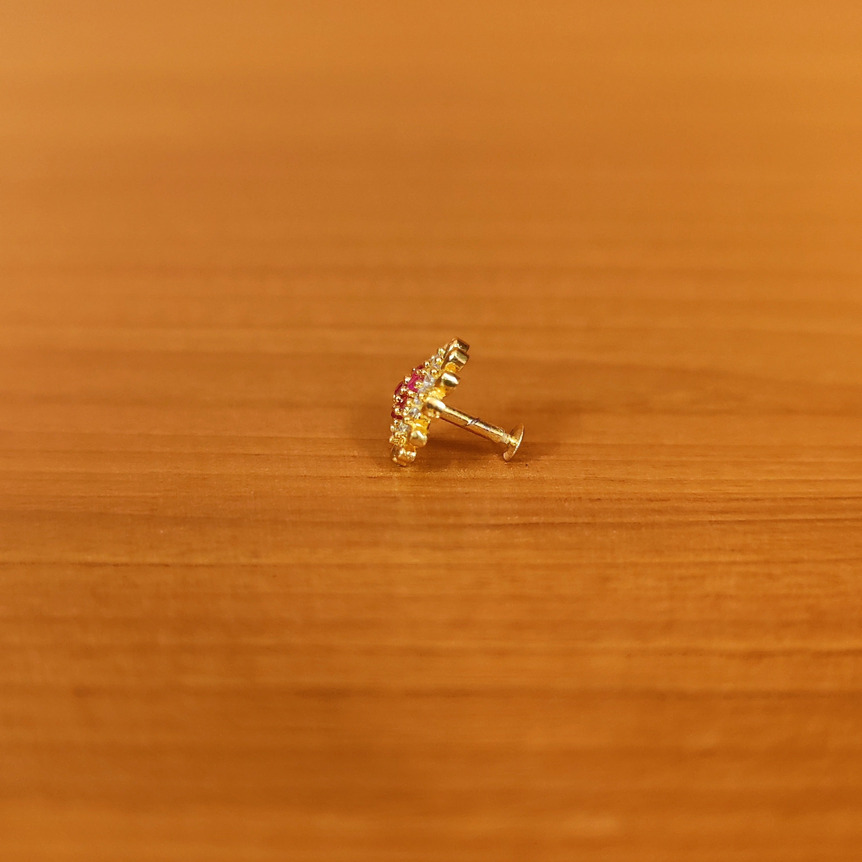 This flower pattern piercing nose ring is handcrafted in silver alloy with imitation ruby colour cz stones of very fine quality , the nose ring is very light in weight and plated with 18kt gold rhodium to give it a real gold look.