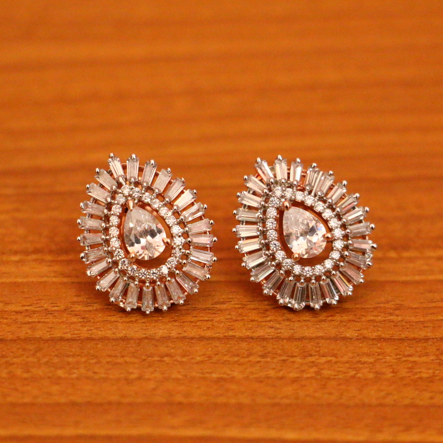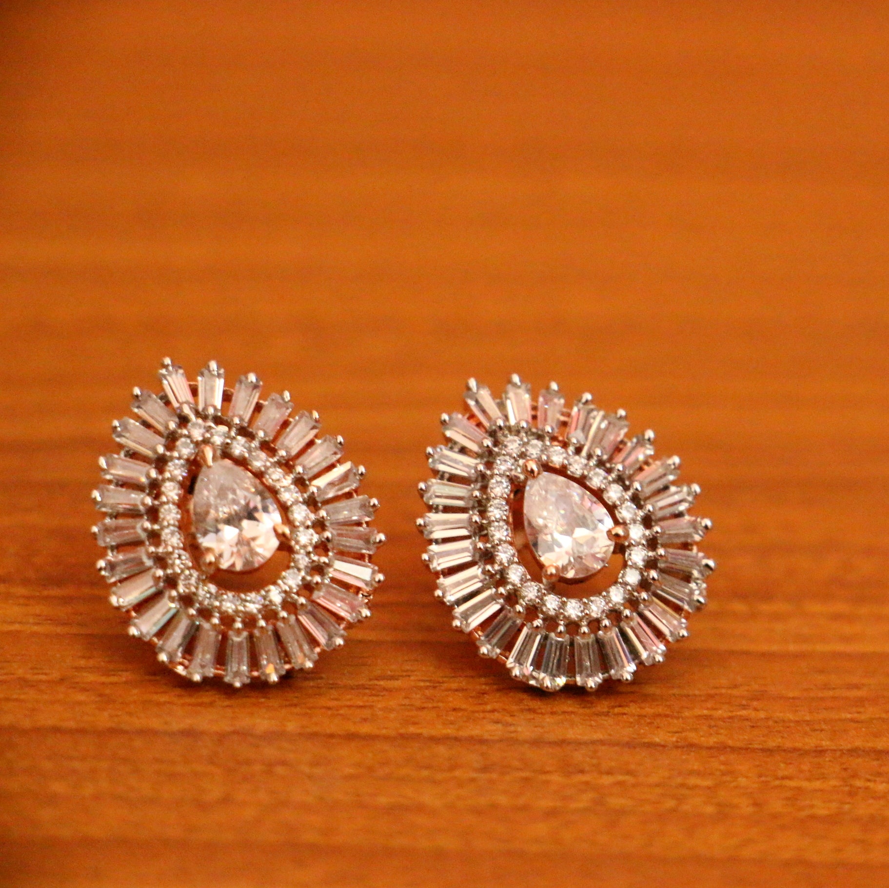 These diamond look studs are handcrafted in silver alloy with imitation cz stones of very fine quality. These earrings are plated in rose gold rhodium plating which gives the design a real jewelry look .