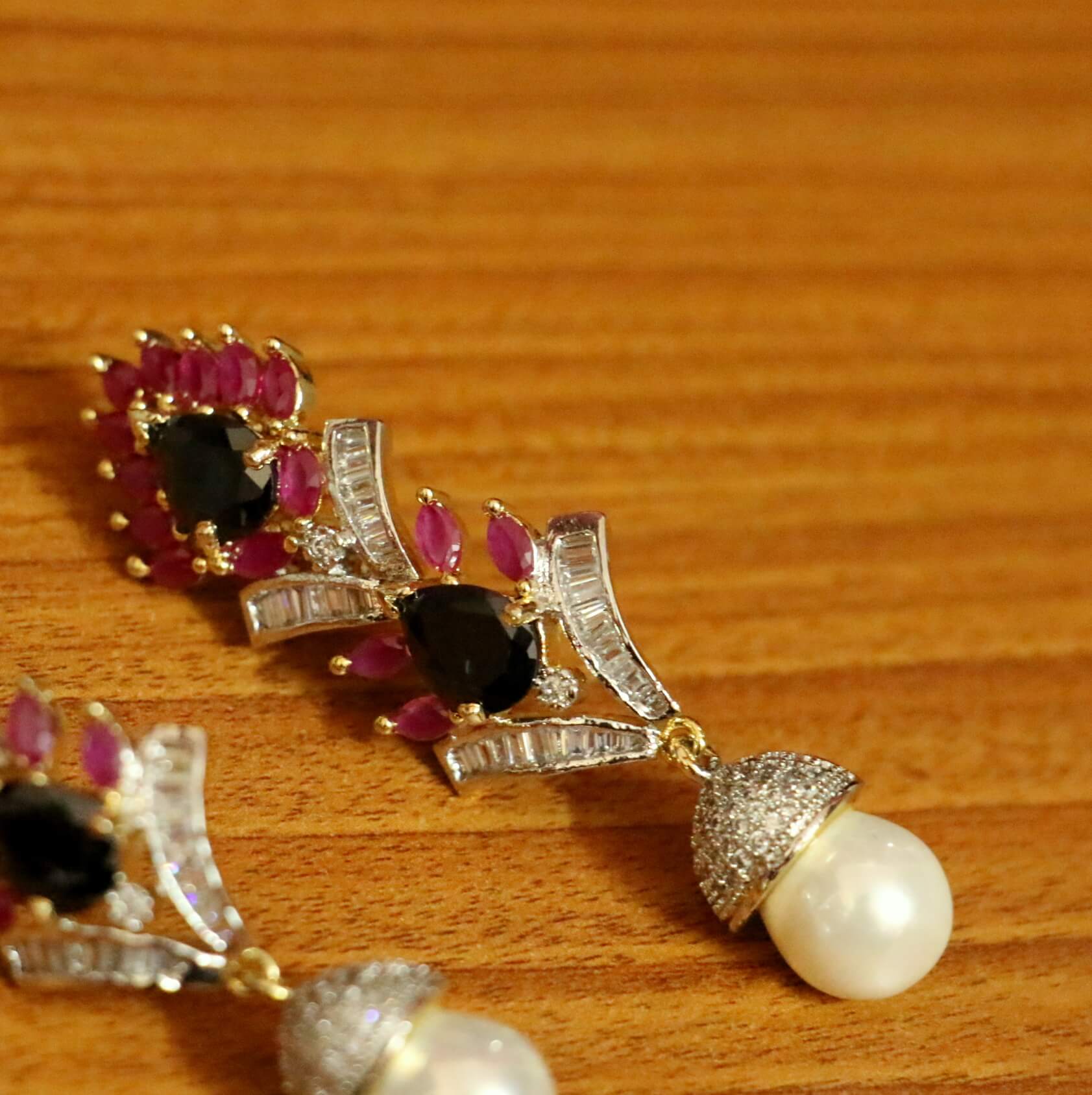 These diamond look danglers are handcrafted in silver alloy with imitation black onyx colour quartz, pearl & cz stones of very fine quality. These earrings are plated in 18kt gold rhodium plating which gives the design a real jewelry look .