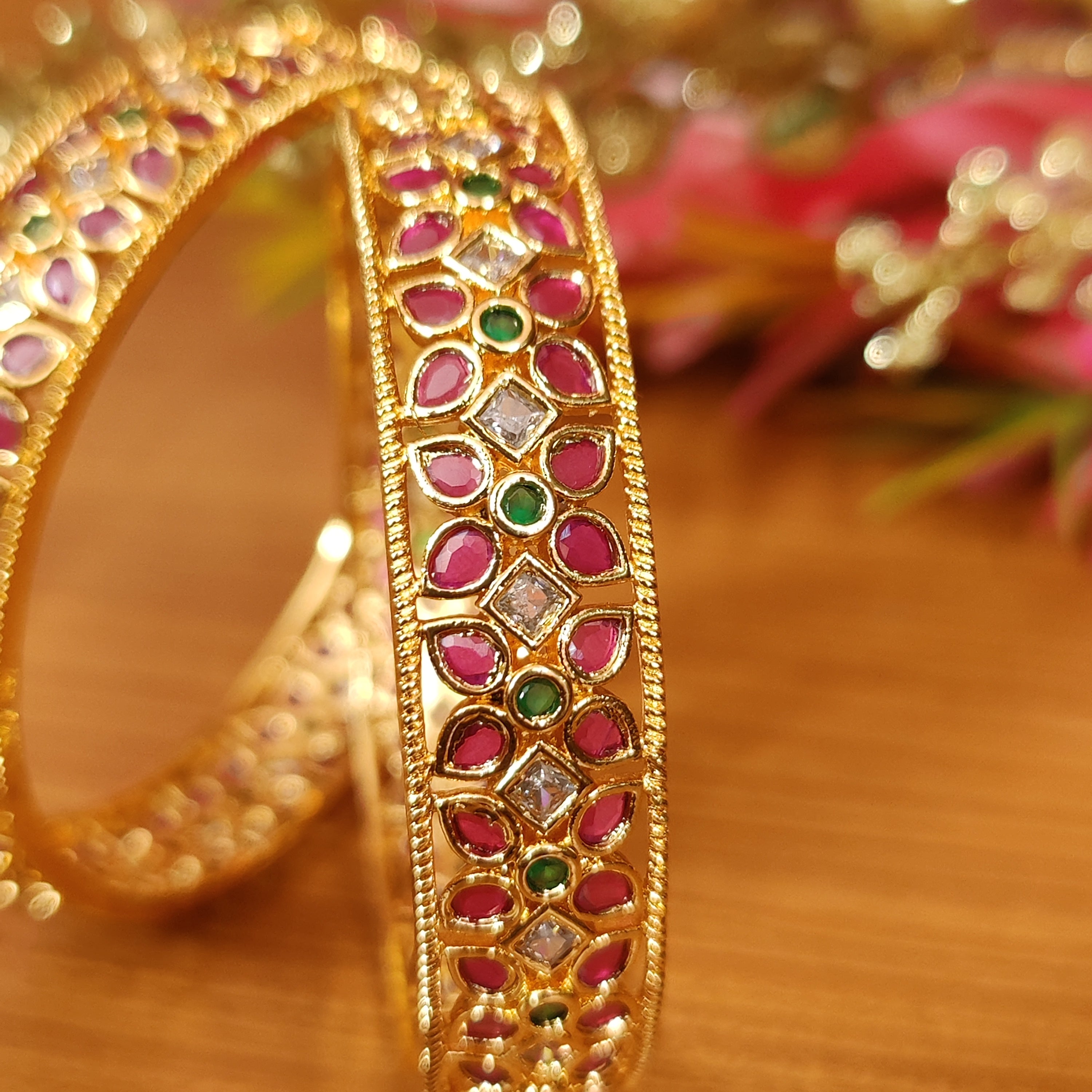 This set of gold plated bangles features stunning ruby and emerald colour stones, adding a touch of glamour to any outfit. The lightweight design and fine craftsmanship make them comfortable to wear, while the beautiful flower pattern adds an elegant touch. Upgrade your jewelry collection with these exquisite bangles.