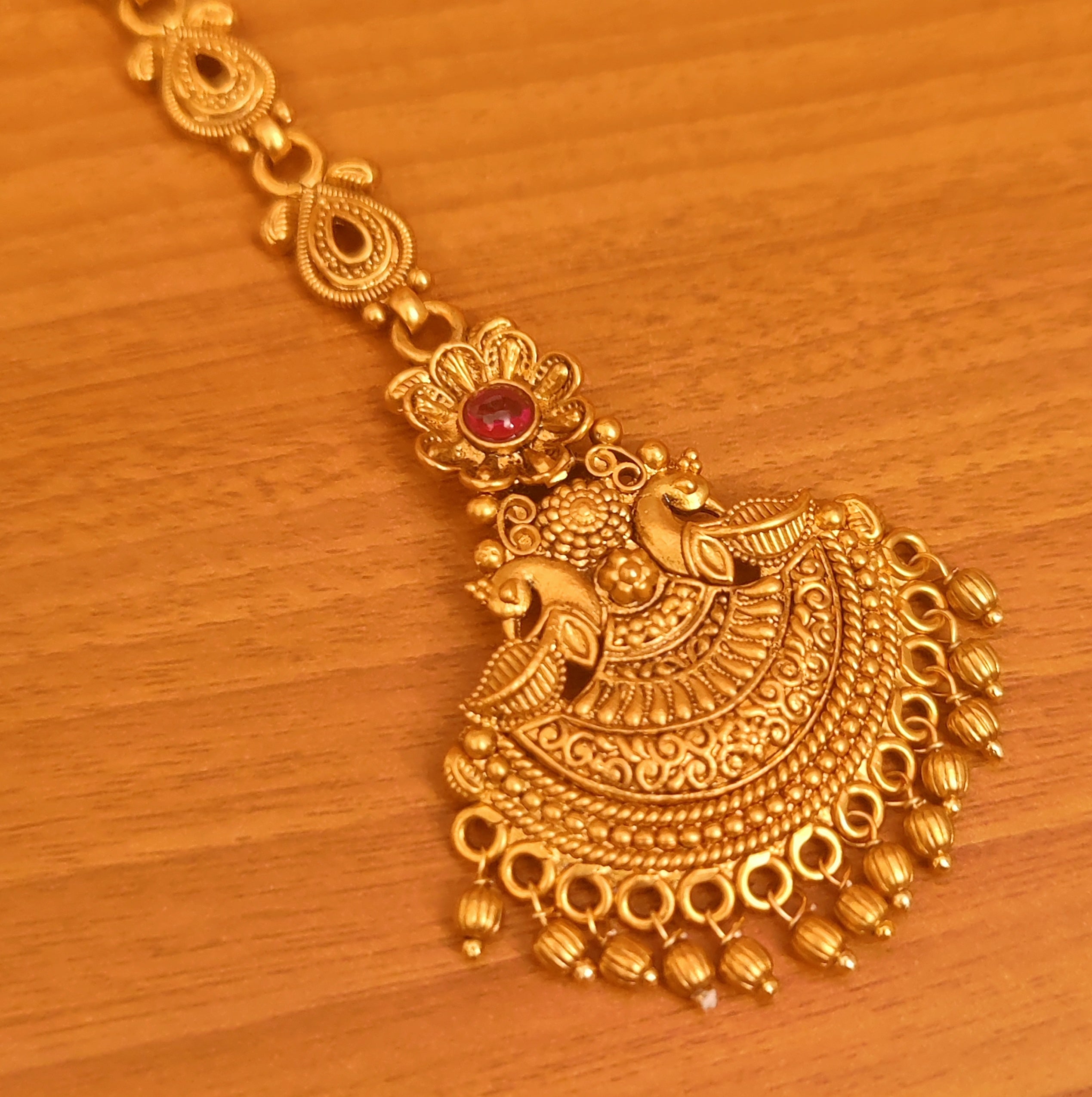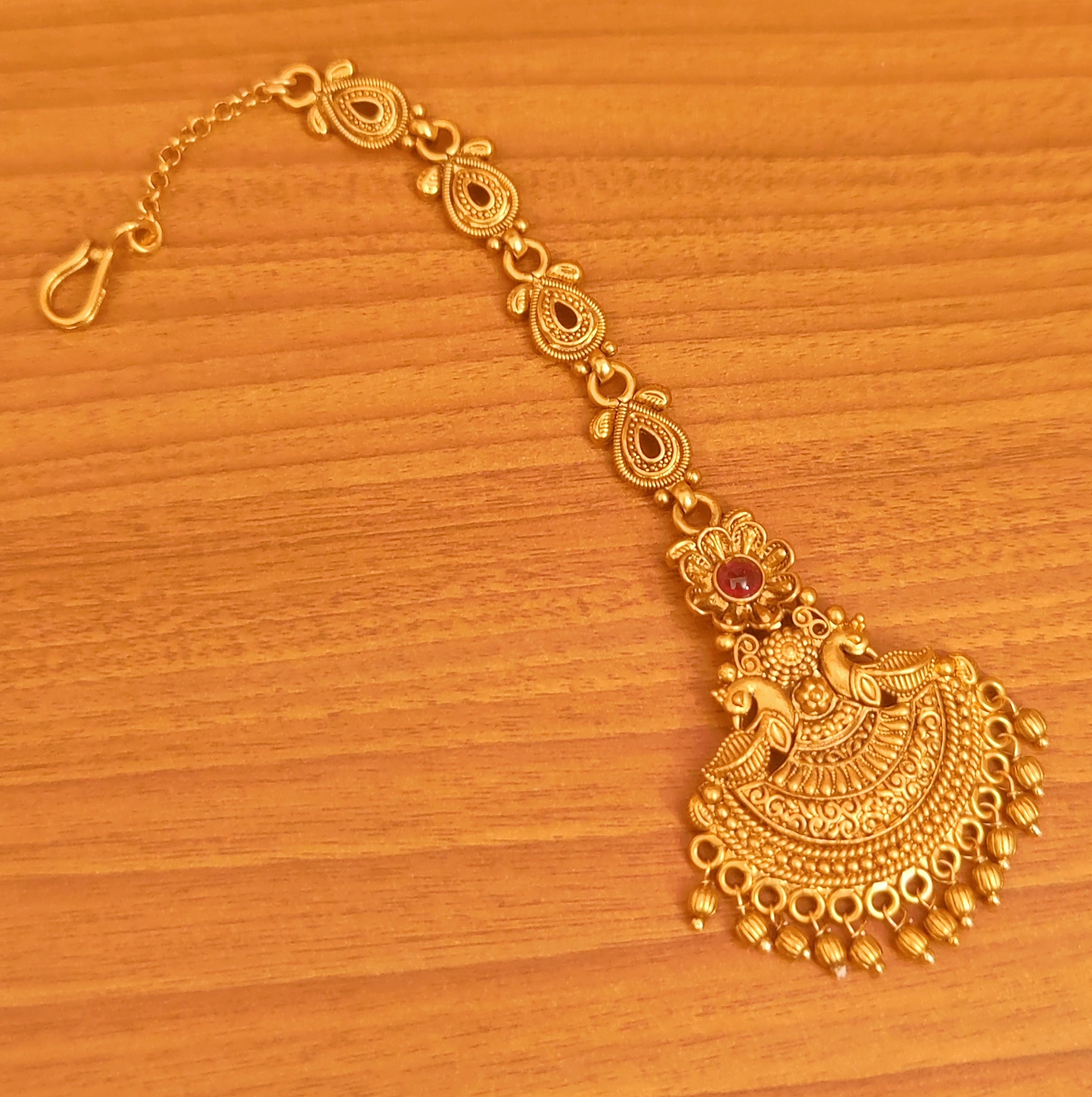 RUBY KEMPU STONE PEACOCK GOLD LOOK MAANG TIKKA