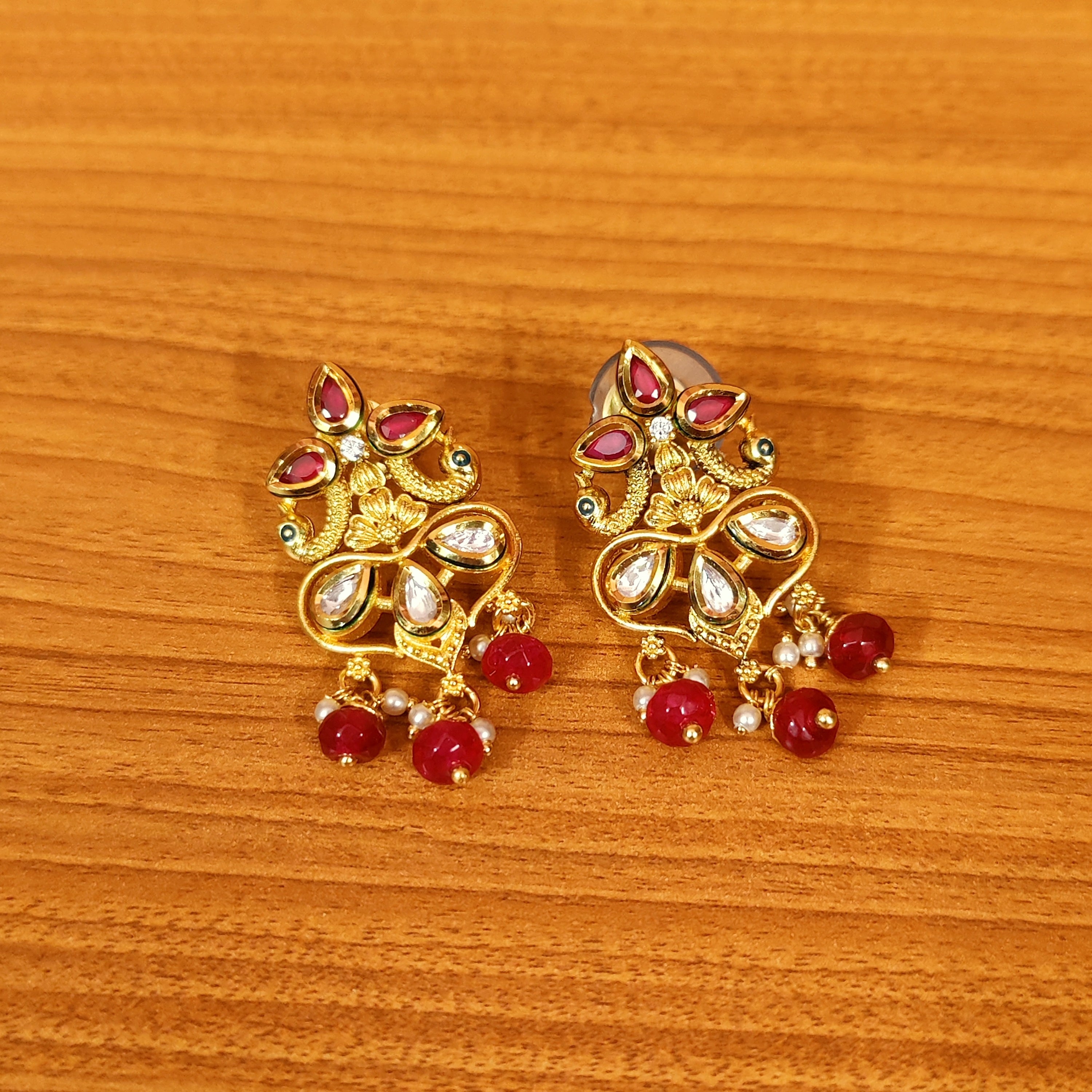 This handcrafted beautiful pendant set Is made in silver alloy with imitation ruby colour red stone & pearls, beads and kundan polki stones of extremely fine quality. This gorgeous pendant set is handcrafted with fine engravings done with hand and is plated 18kt nickle free gold rhodium that gives the design a real gold look . the pendant comes with a matching pair of earrings which are absolutely gorgeous and are very light in weight.