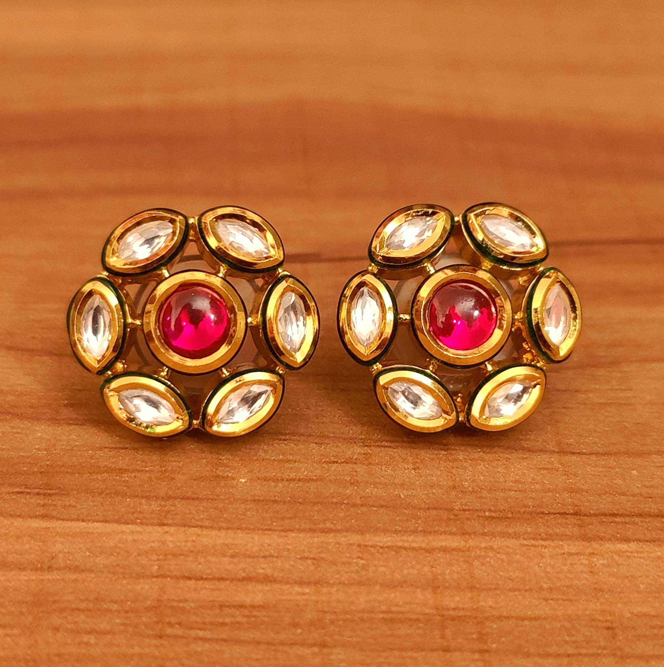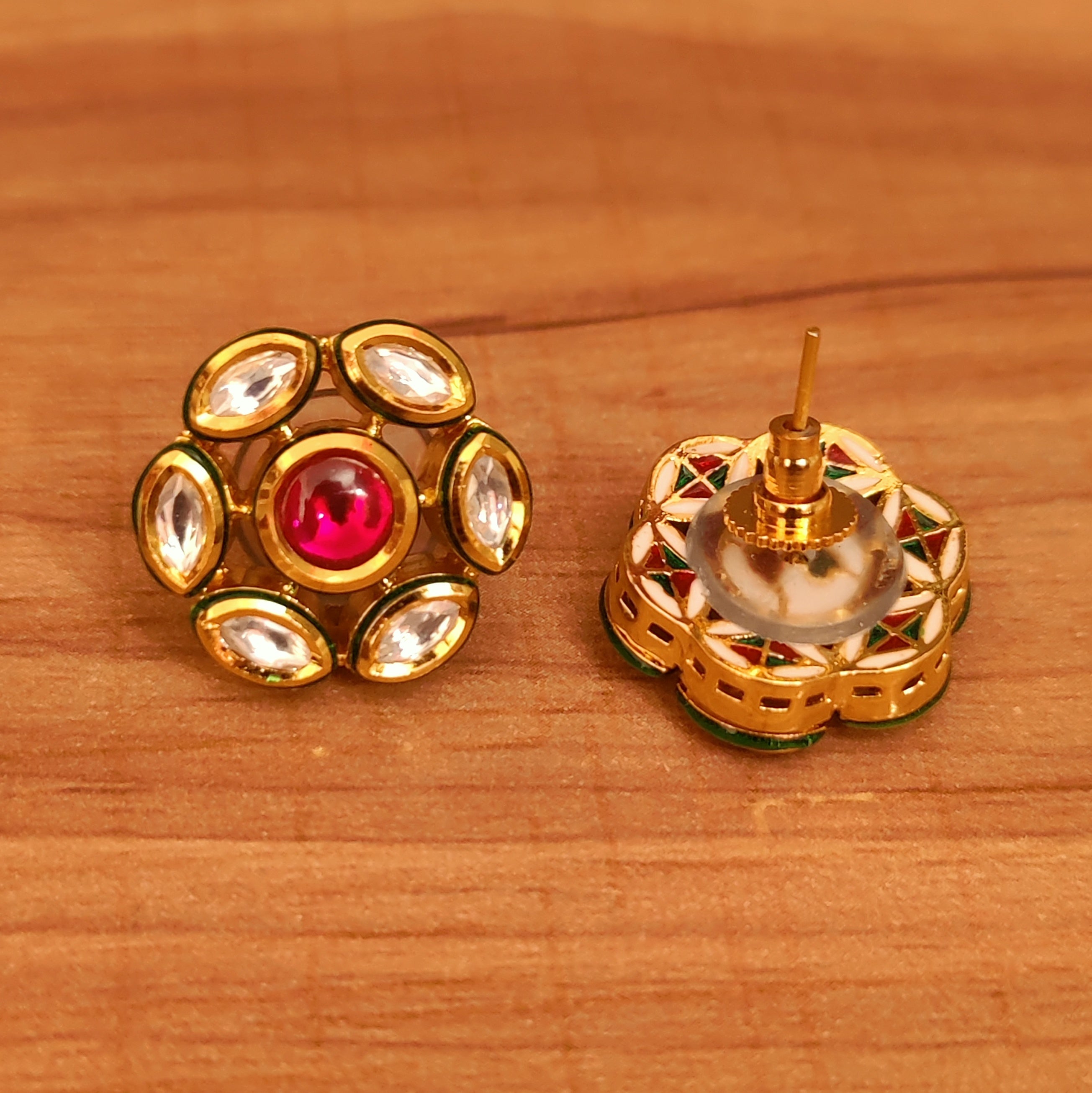 These beautiful studs are handcrafted in brass alloy with imitation red colour stone & kundan with meenakari work of very fine quality. these artistic yet modern earrings are plated with high quality gold rhodium. the earrings are very light in weight.