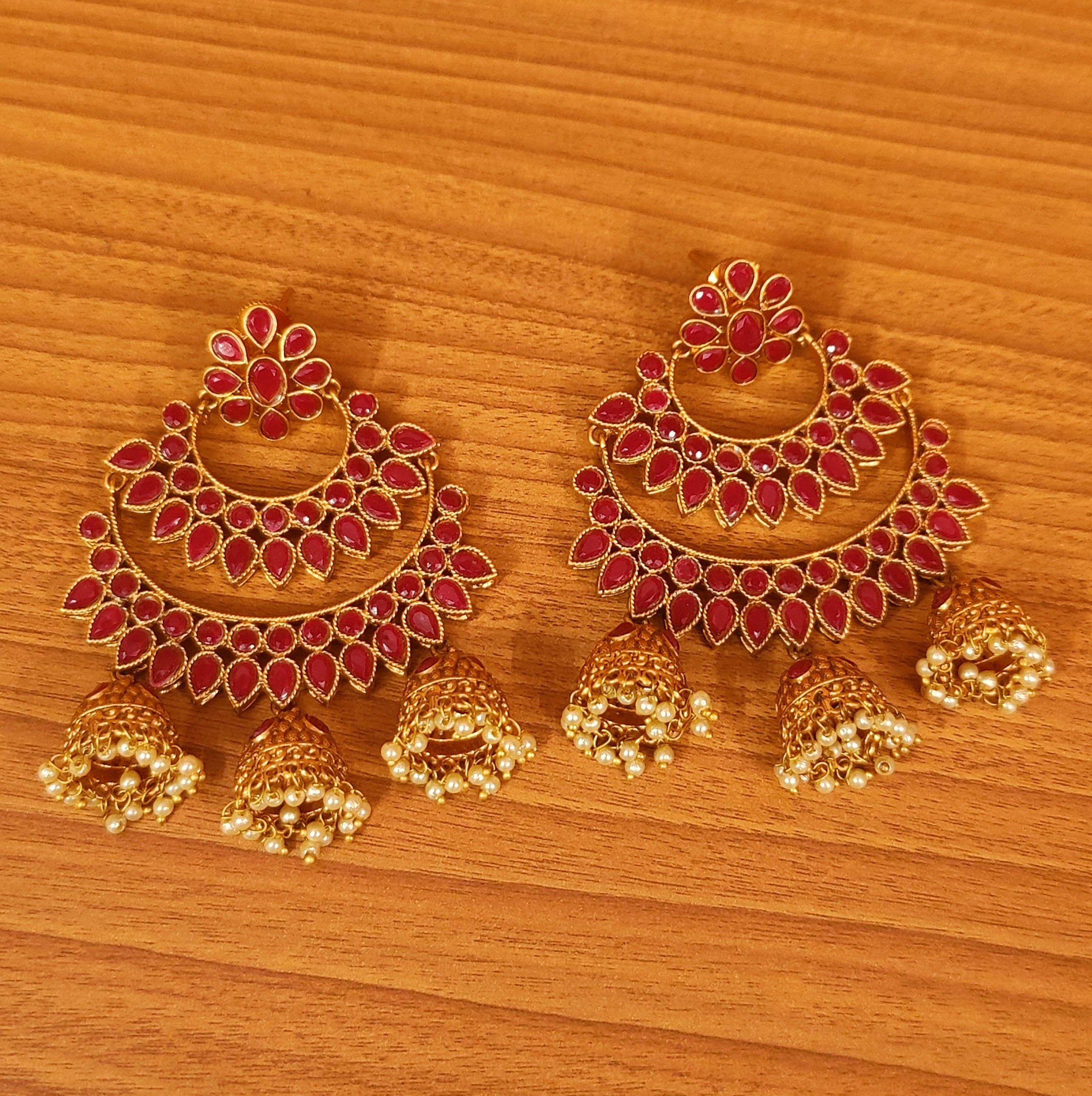 These ruby matt gold look chaandbaali earrings are handcrafted in copper alloy with imitation ruby stones & pearls of fine quality. These artistic yet modern earrings are plated with fine nickle free matt gold rhodium to avoid any allergies to the skin.