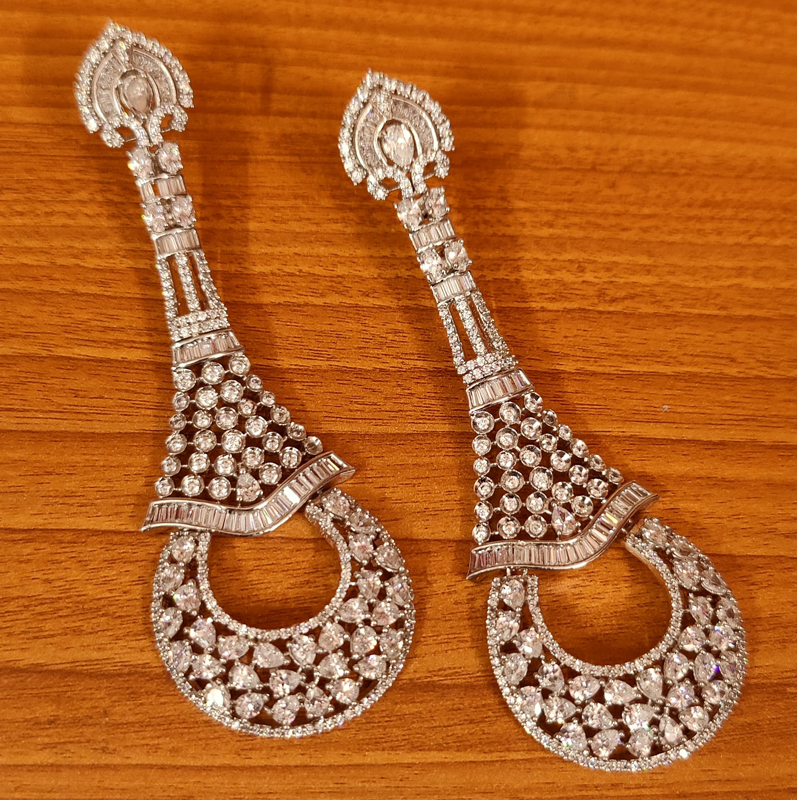 These diamond look earrings are handcrafted in silver alloy with imitation cz signity stones which are of the finest quality of american diamond . These party wear earrings are handcrafted with cz signity stones to perfection with fine setting and plated with real 18kt fine nickel white gold rhodium that gives a real diamond look to the design.