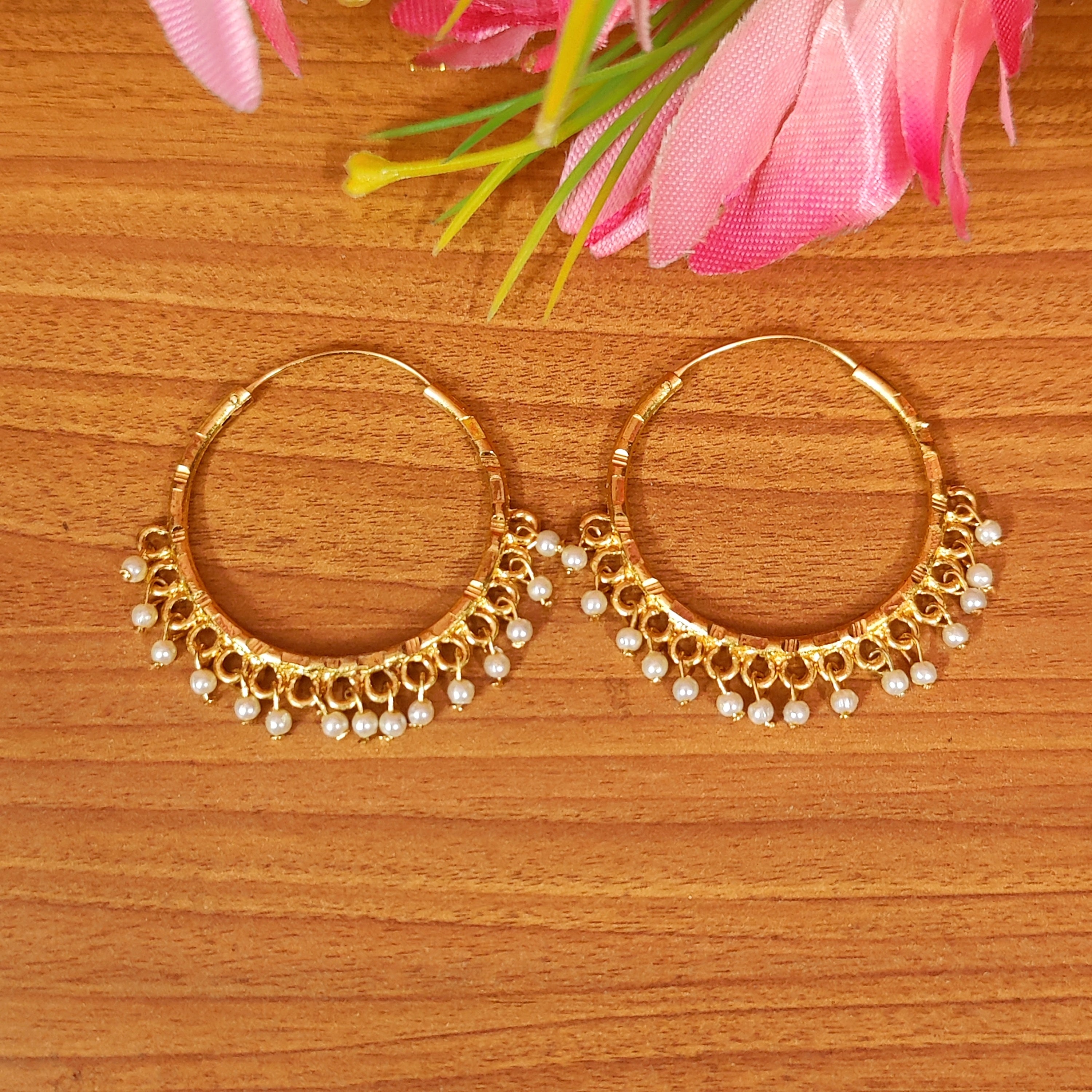 Make an impression with these stunning gold hoops! Lightweight and easy to wear, they feature delicate dangling pearls that add a touch of sophistication. Perfect for special occasions, these are sure to have you looking your best.