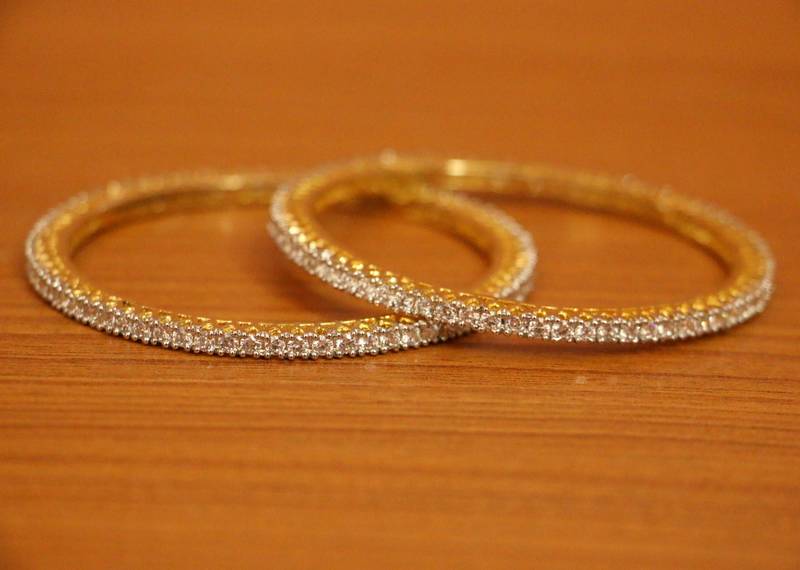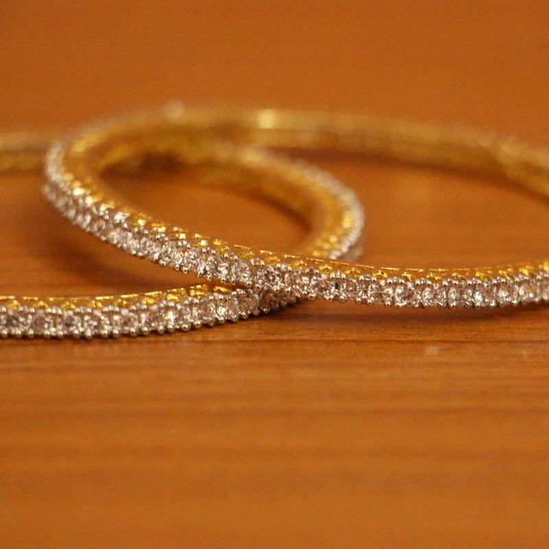 These bangles are handcrafted in silver & brass alloy with imitation cz stones work of very fine quality. These artistic yet modern bangles are plated with fine nickle free gold rhodium to avoid any allergies to the skin.