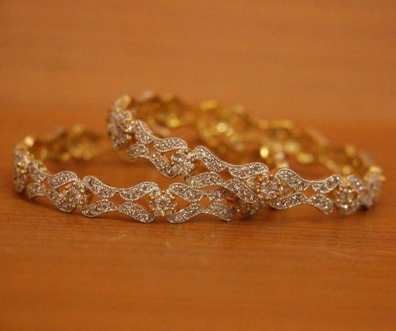 These bangles are handcrafted in silver & brass alloy with imitation cz stones work of very fine quality. These artistic yet modern bangles are plated with fine nickle free gold rhodium to avoid any allergies to the skin.