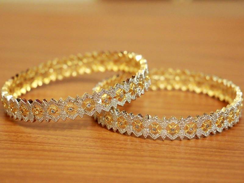 These bangles are handcrafted in silver & brass alloy with imitation cz stones of very fine quality. These artistic yet modern bangles are plated with fine nickle free gold rhodium to avoid any allergies to the skin.