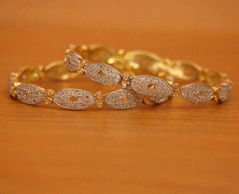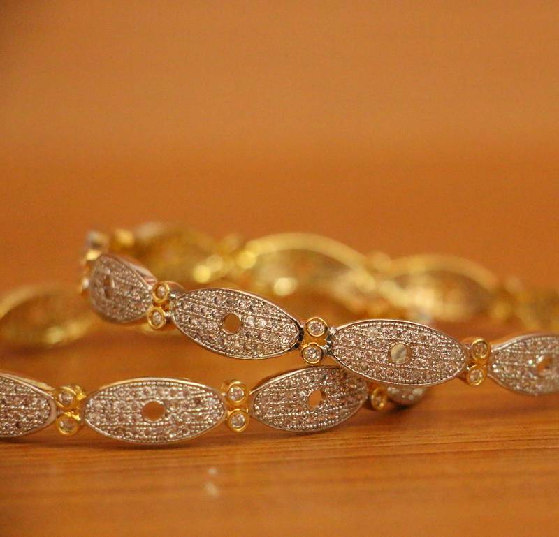 These bangles are handcrafted in silver & brass alloy with imitation cz stones work of very fine quality. These artistic yet modern bangles are plated with fine nickle free gold rhodium to avoid any allergies to the skin.