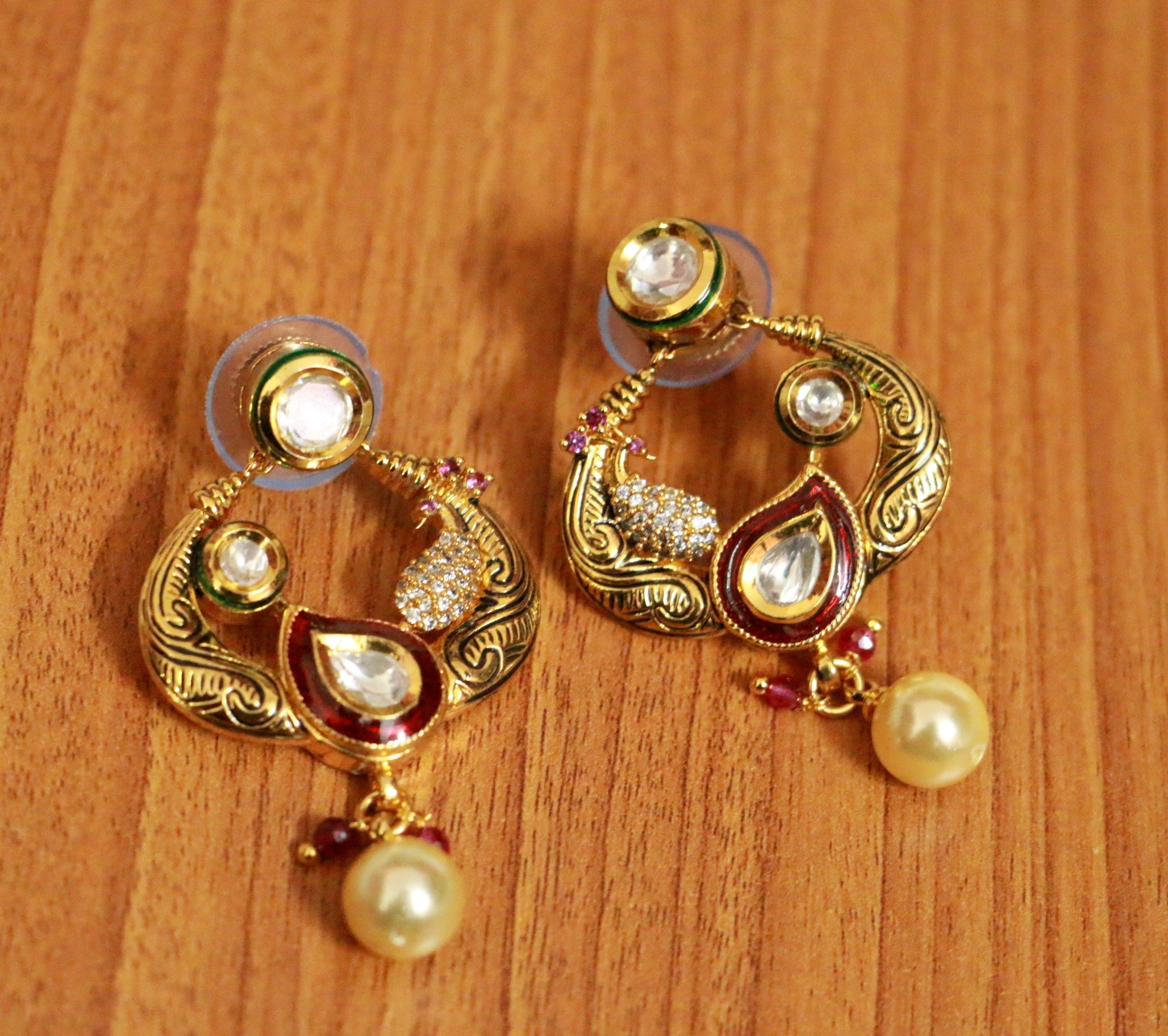This beautiful earrings is handcrafted in brass alloy with imitation pearl, american diamond & kundan with meenakari work of very fine quality . This earrings is coated with 18 kt gold polish which give them a unique look . An absolutely stunning piece to own and are very light in weight.