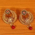 These gold look chandbali earrings are handcrafted in copper alloy with imitation ruby colour stone & beads and polki work of very fine quality. These party wear chandbali's are plated with real 18kt fine nickel free gold rhodium to avoid any allergies to the skin. These earrings are very light weighed and can be worn with ethnic dresses.