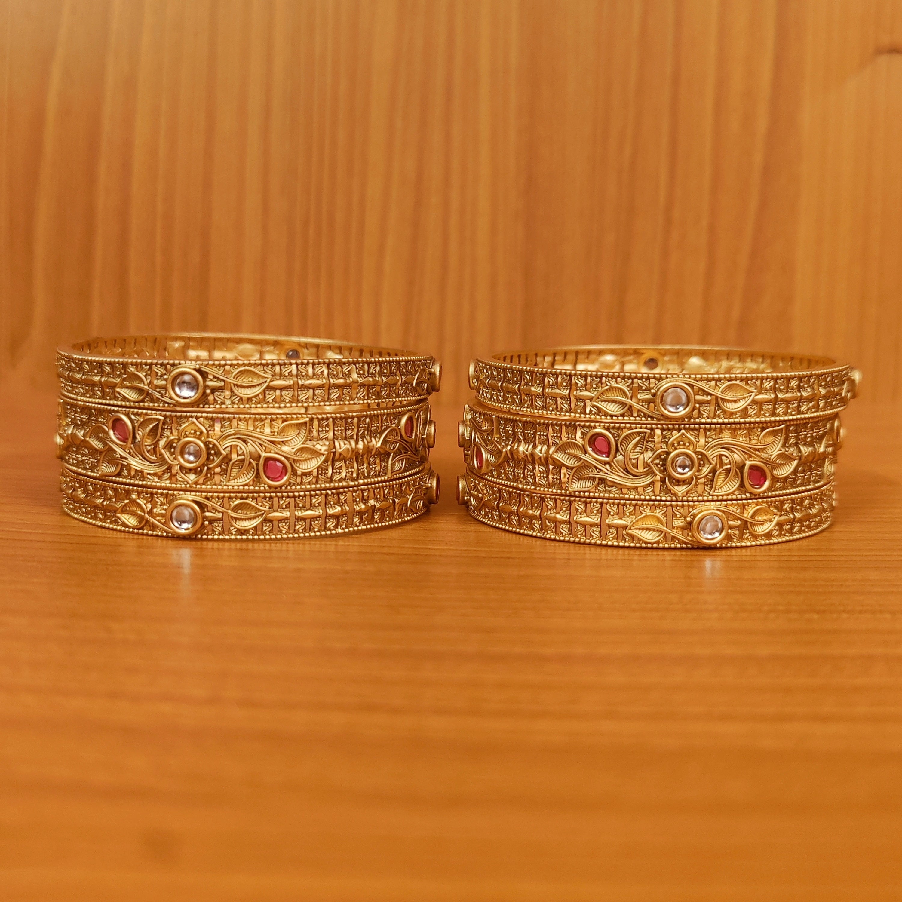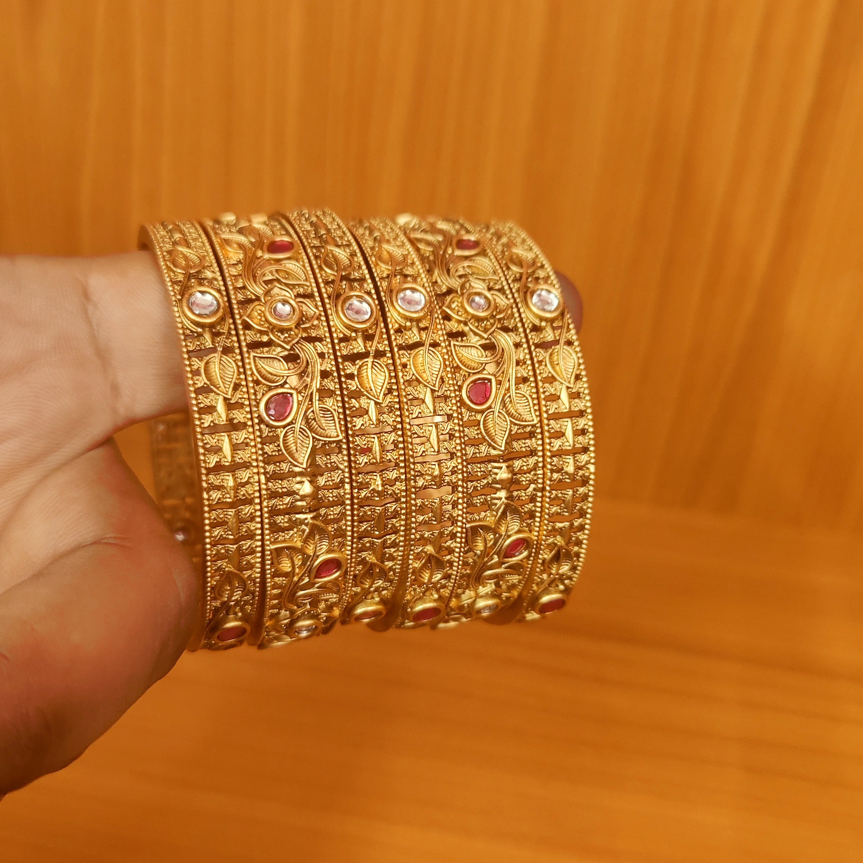These beautiful antique gold bangles are handcrafted in copper alloy with imitation ruby colour stones and kundan polki stones of very fine quality. These bangles are coated with 22 kt matt gold rajwadi plating that gives a real look to the design and these intricate bangles comes with a set of 6 bangles.