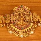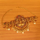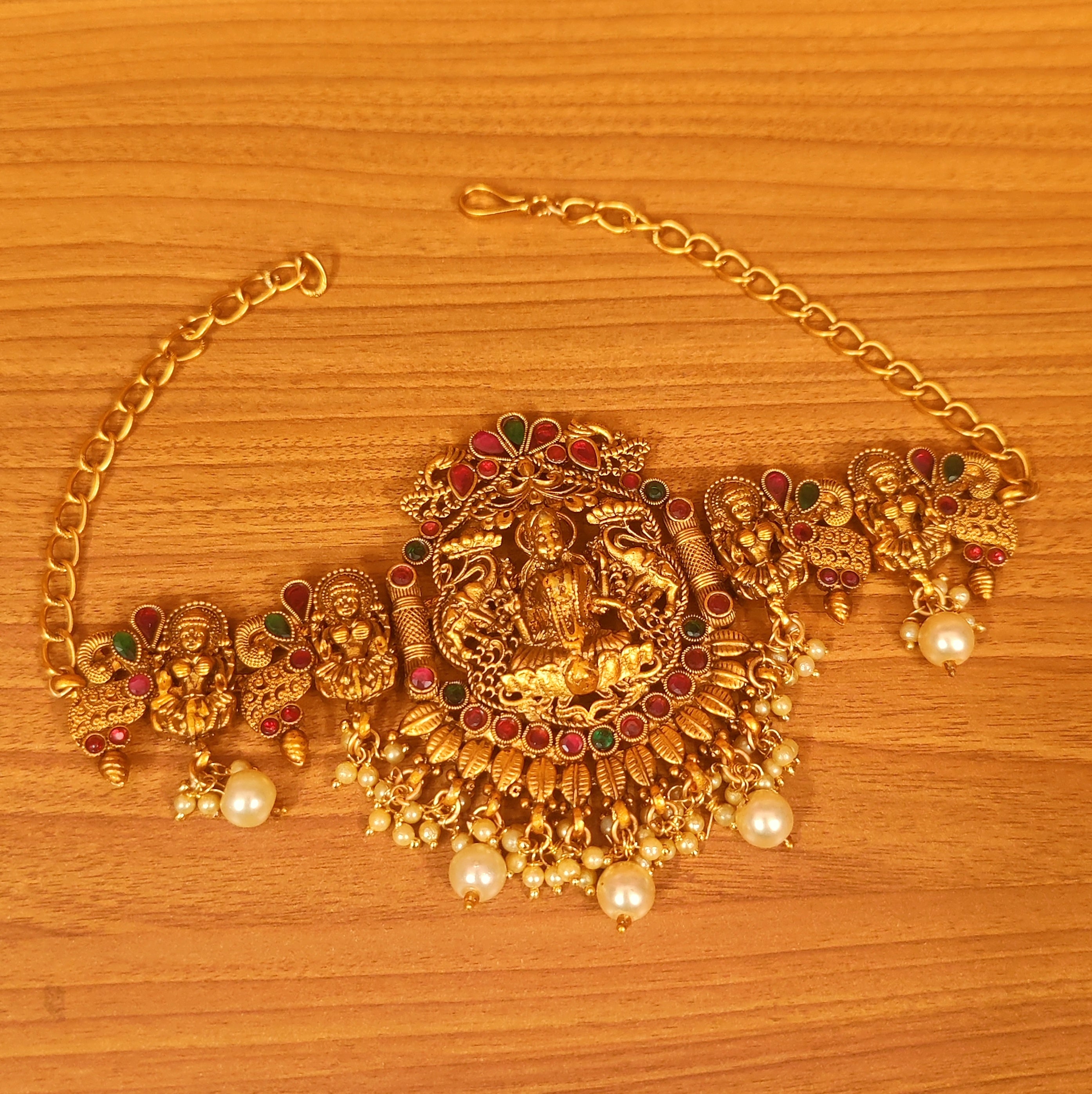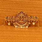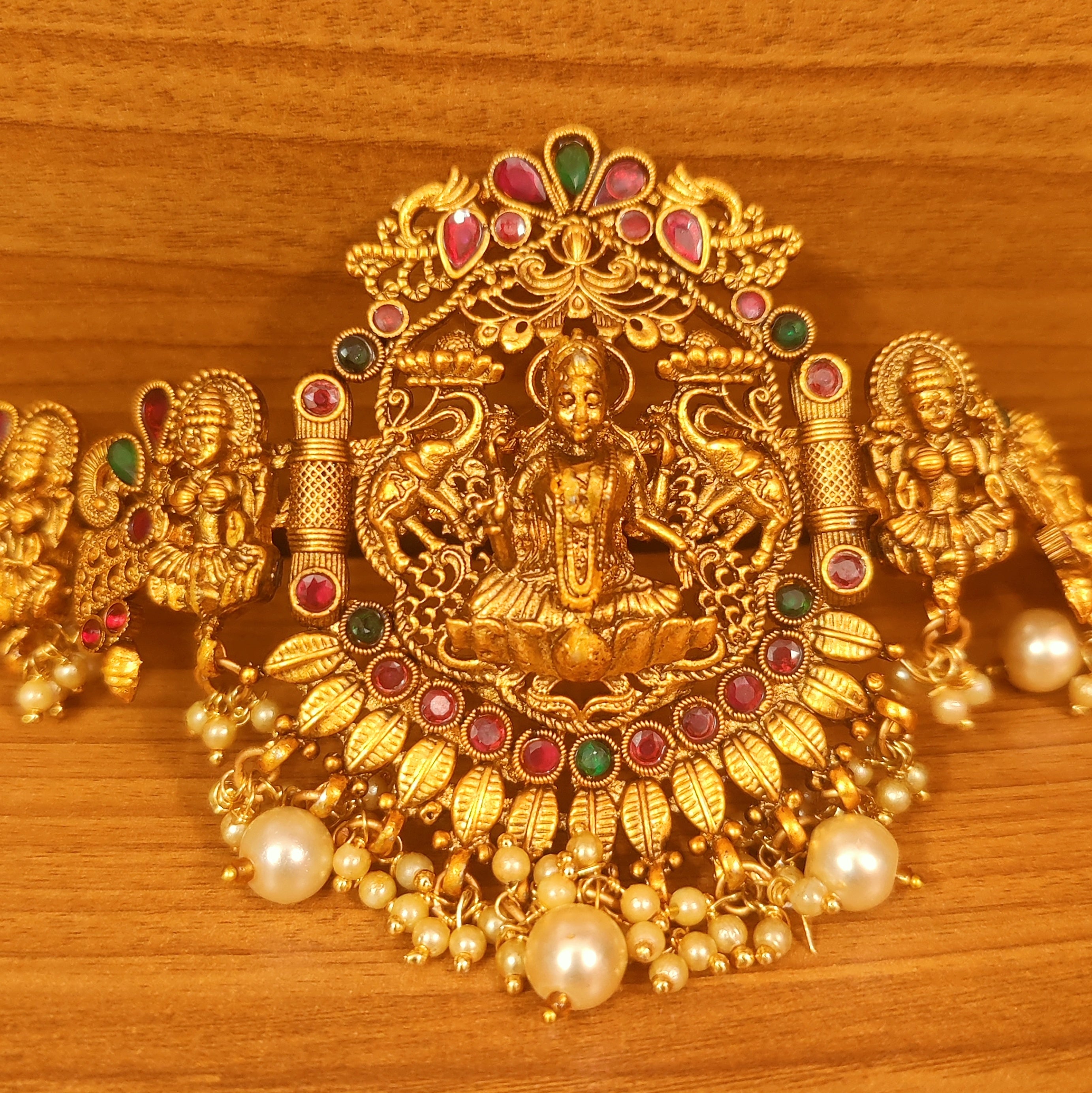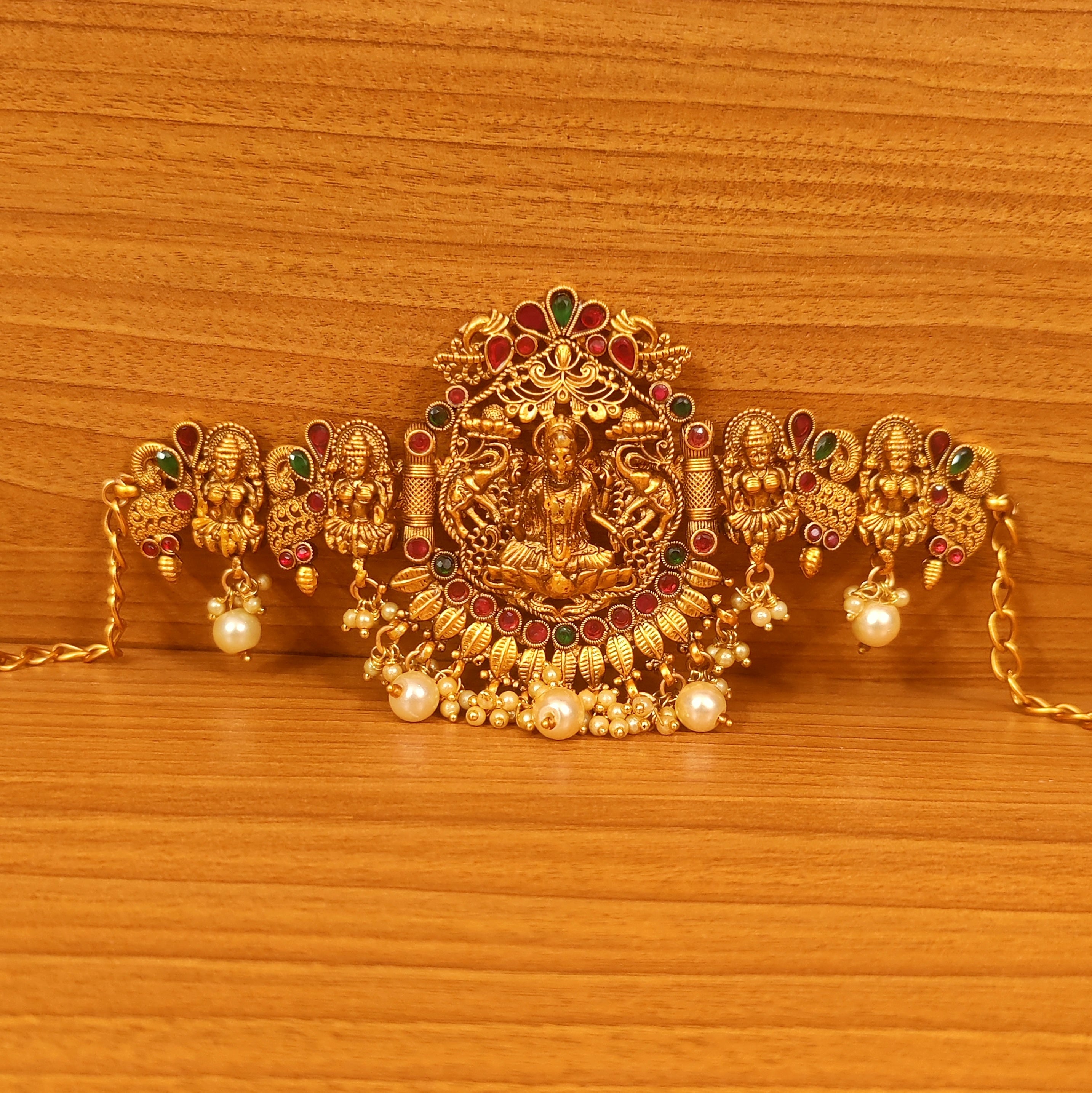 This polished bajuband, crafted with care from a copper alloy and containing imitation red and green stones and pearls of superior quality, boasts intricately-rendered Lakshmi figures and is finished with a luxurious layer of matt gold rhodium plated in 22kt gold, lending a gleaming gold-like veneer to its stylish design.