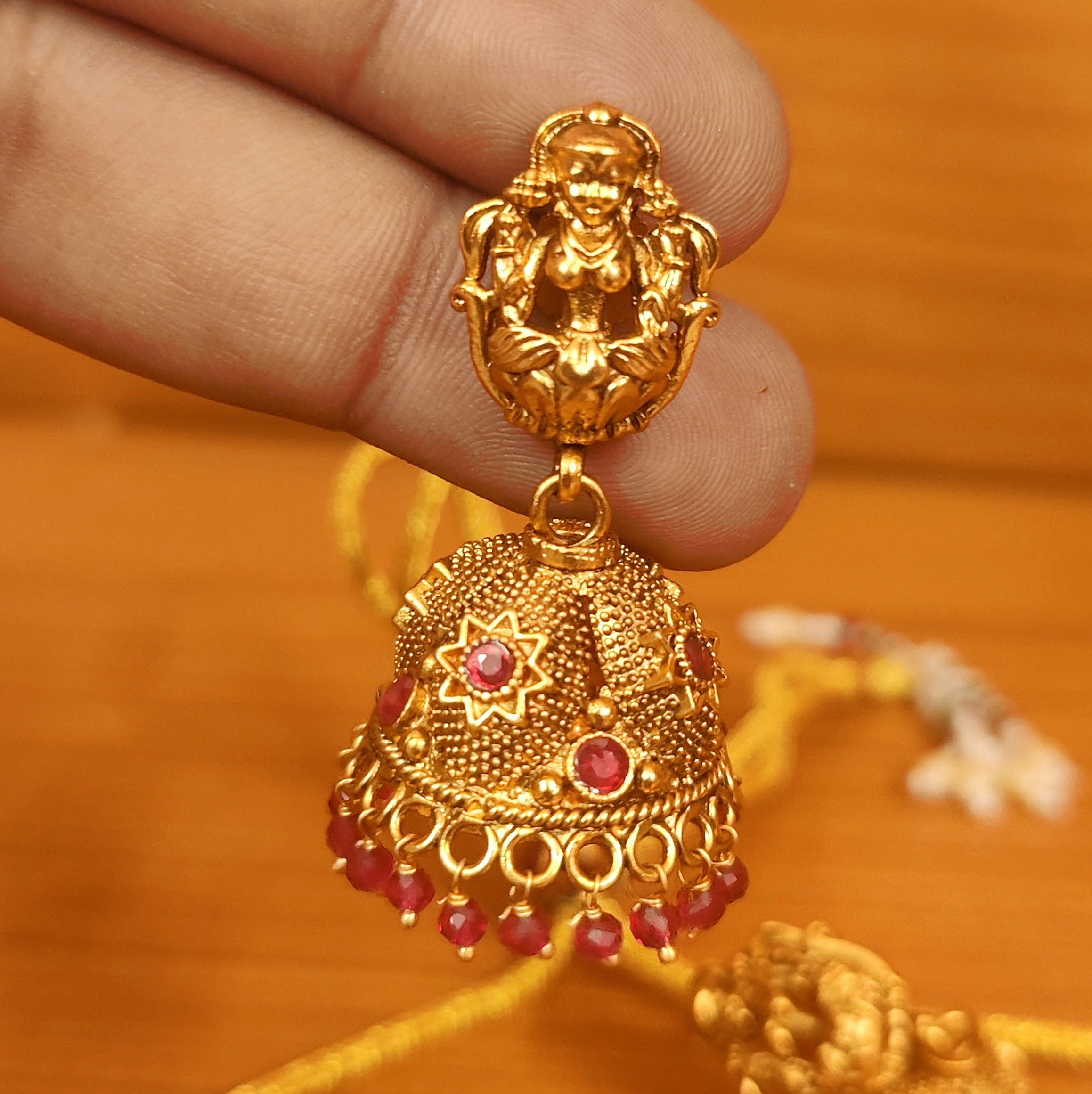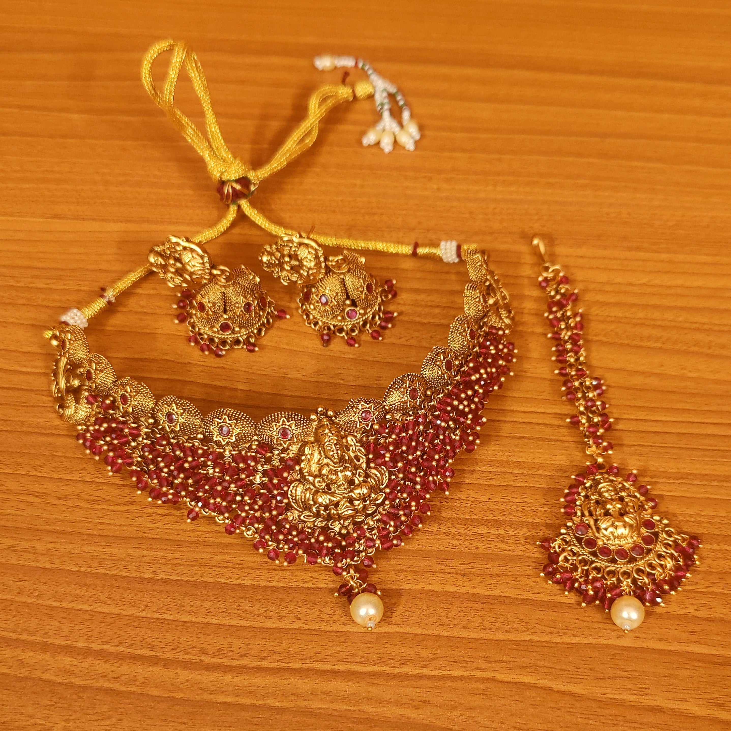 ANTIQUE GOLD TEMPLE LOOK RED CRYSTAL NECKLACE SET