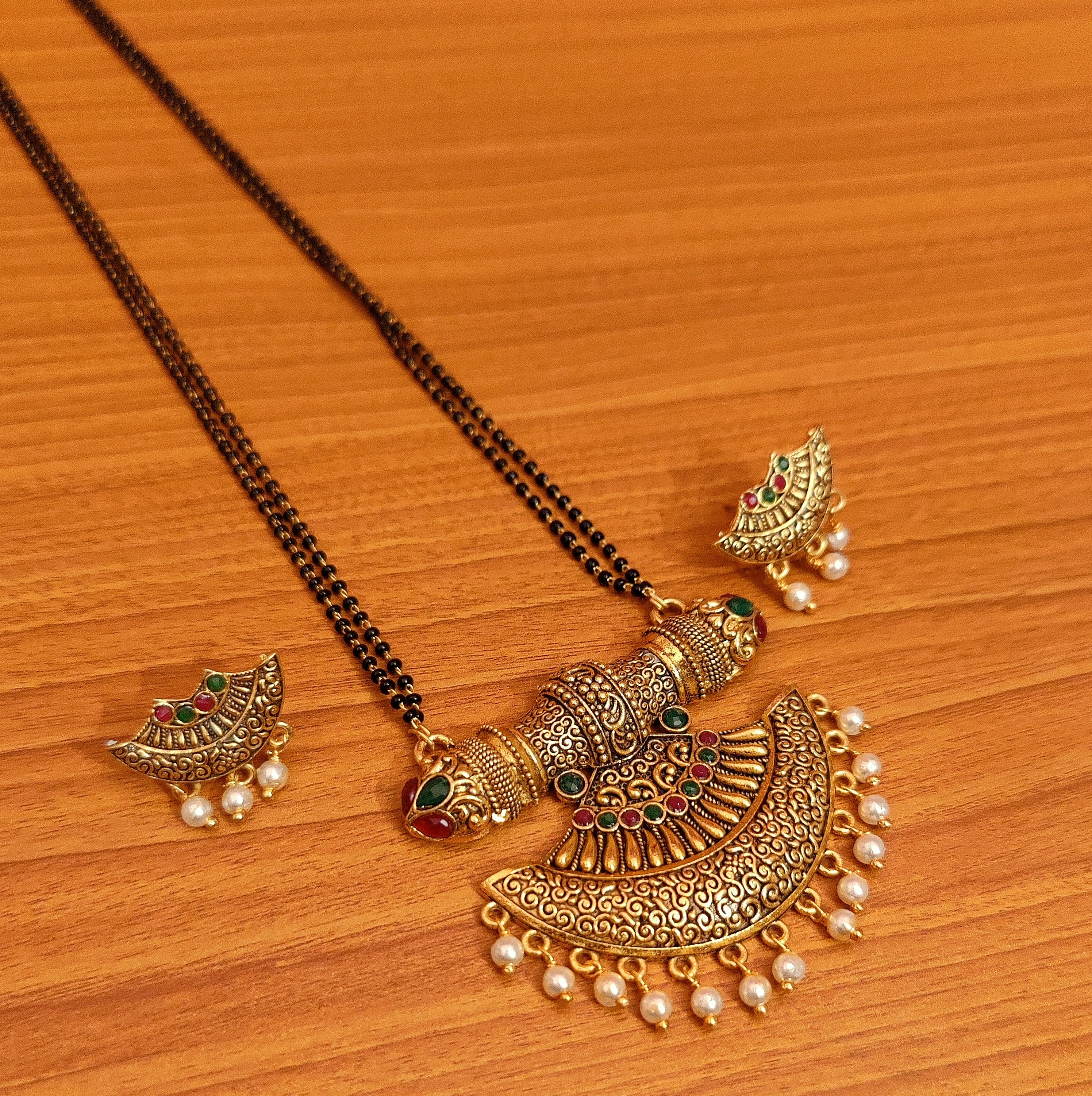 This beautiful antique gold polki mangalsutra is handcrafted in copper alloy with imitation red & green colour stone and pearls of very fine quality , this mangalsutra is coated with 18 kt nickle free antique gold plating to avoid skin allergies and its very light in weight .
