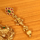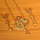 This temple look pendant set is made in copper alloy with imitation red & green colour kempu stones of extremely fine quality. This elegant pendant set is handcrafted to perfection with intricate hand carvings and gold look lord krishna figures. This pendant set is plated with 22kt nickle free matt gold rhodium that gives the design a real gold look . The pendant comes with a matching pair of medium sized earrings which are absolutely gorgeous and are very light in weight.