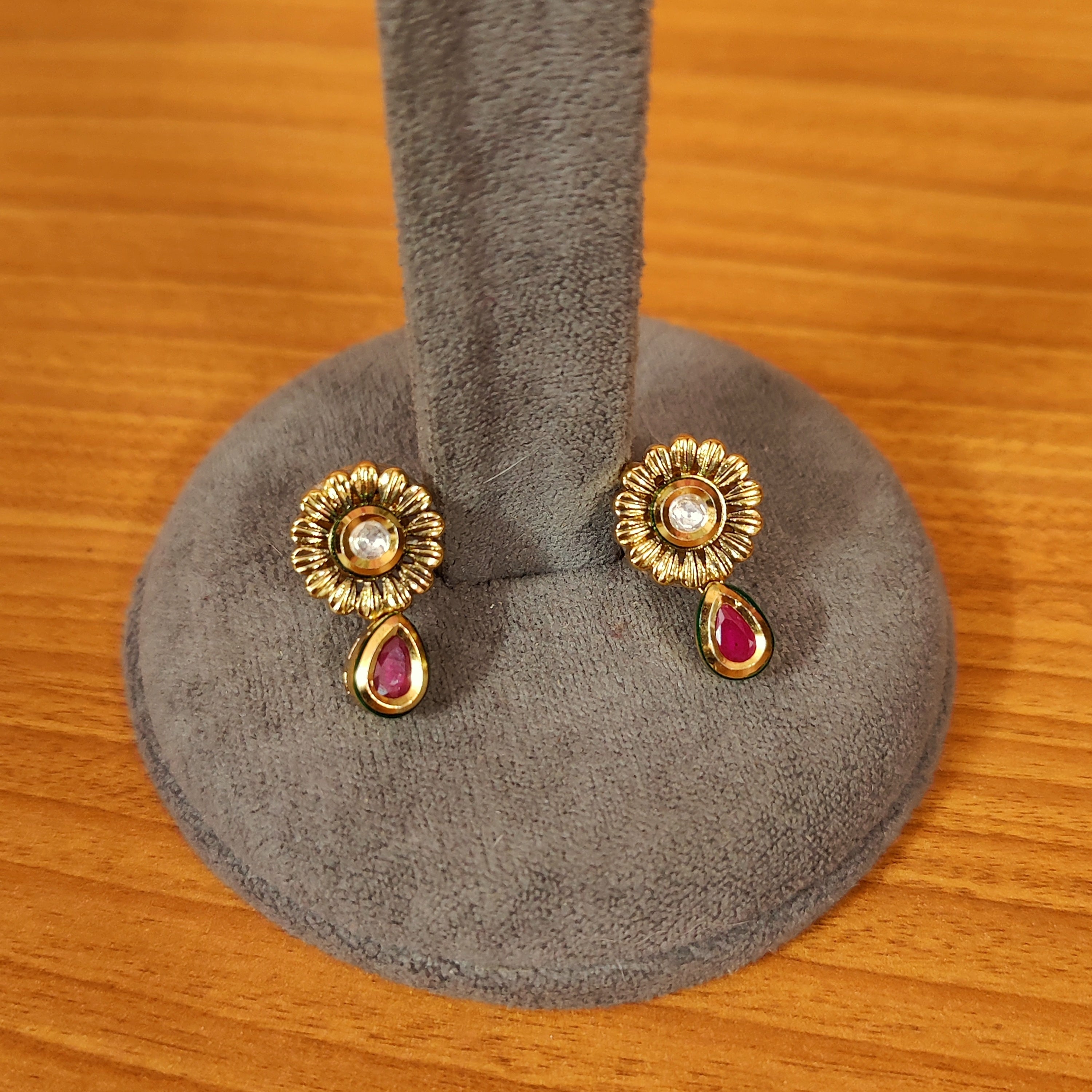 This handcrafted pear shape kundan pendant set Is made in silver alloy with imitation ruby colour red stone and kundan polki stone of extremely fine quality. This gorgeous pendant set is handcrafted with fine engravings done with hand and is plated 18kt nickle free antique gold rhodium that gives the design a real look . the pendant comes with a matching pair of earrings which are absolutely gorgeous and are very light in weight.