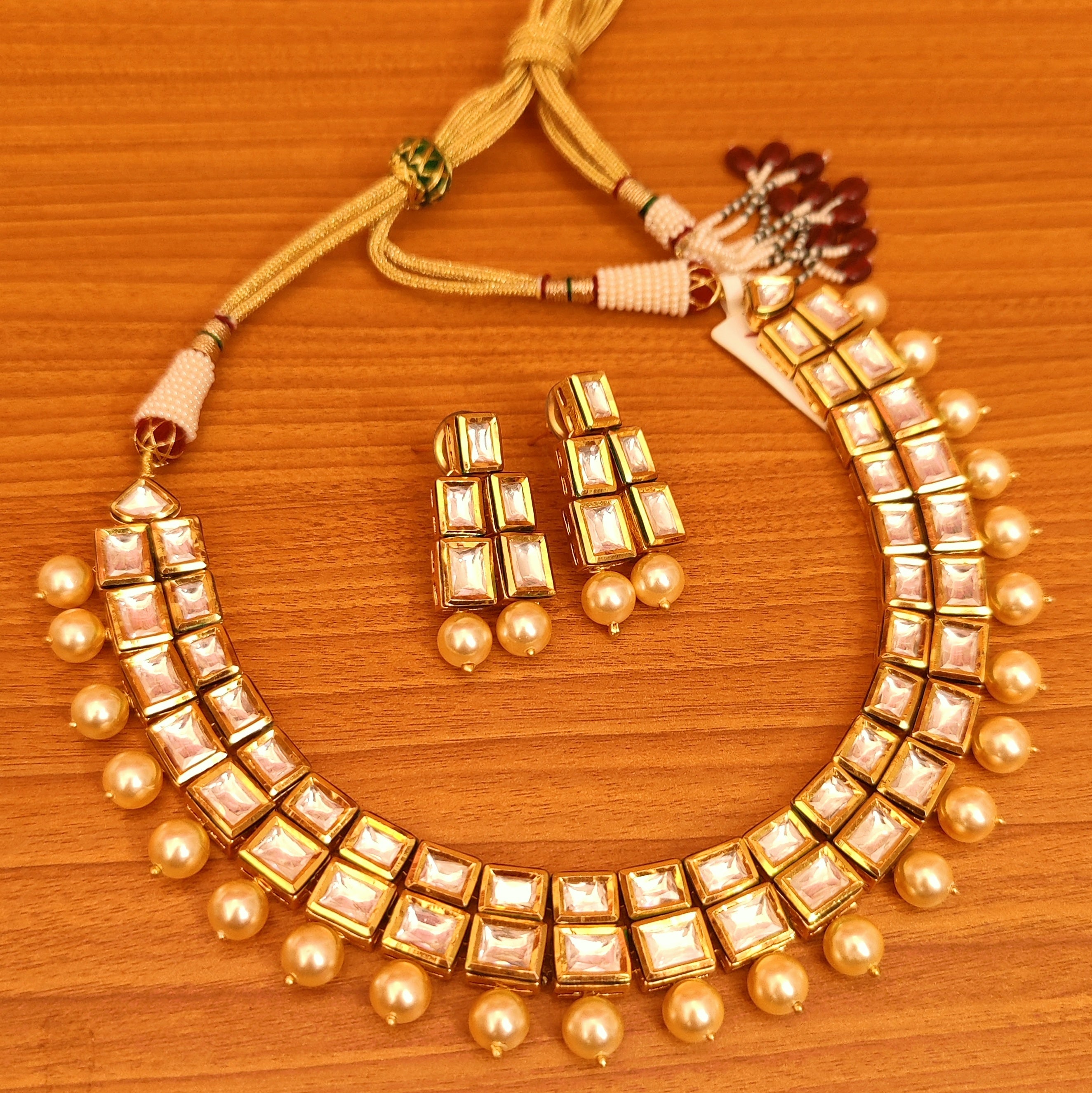 RECTANGLE KUNDAN POLKI & PEARL MEENAKARI NECKLACE SET