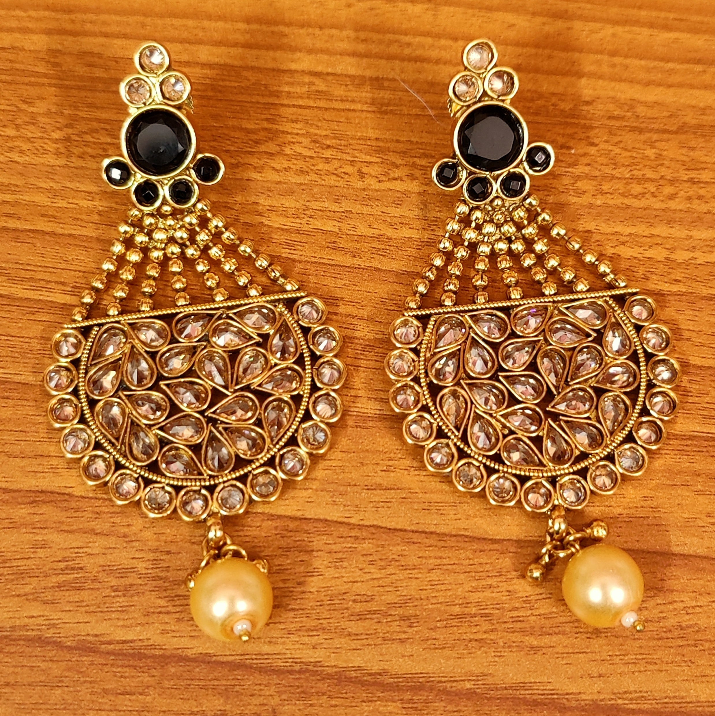 These gold look earrings are handcrafted in copper alloy with imitation black colour stones and polki stones with intricate gold work of very fine quality. These party wear earrings are plated with 18kt gold plating which gives the design a real gold look , the earrings are very light in weight and are perfect for occasional wear.