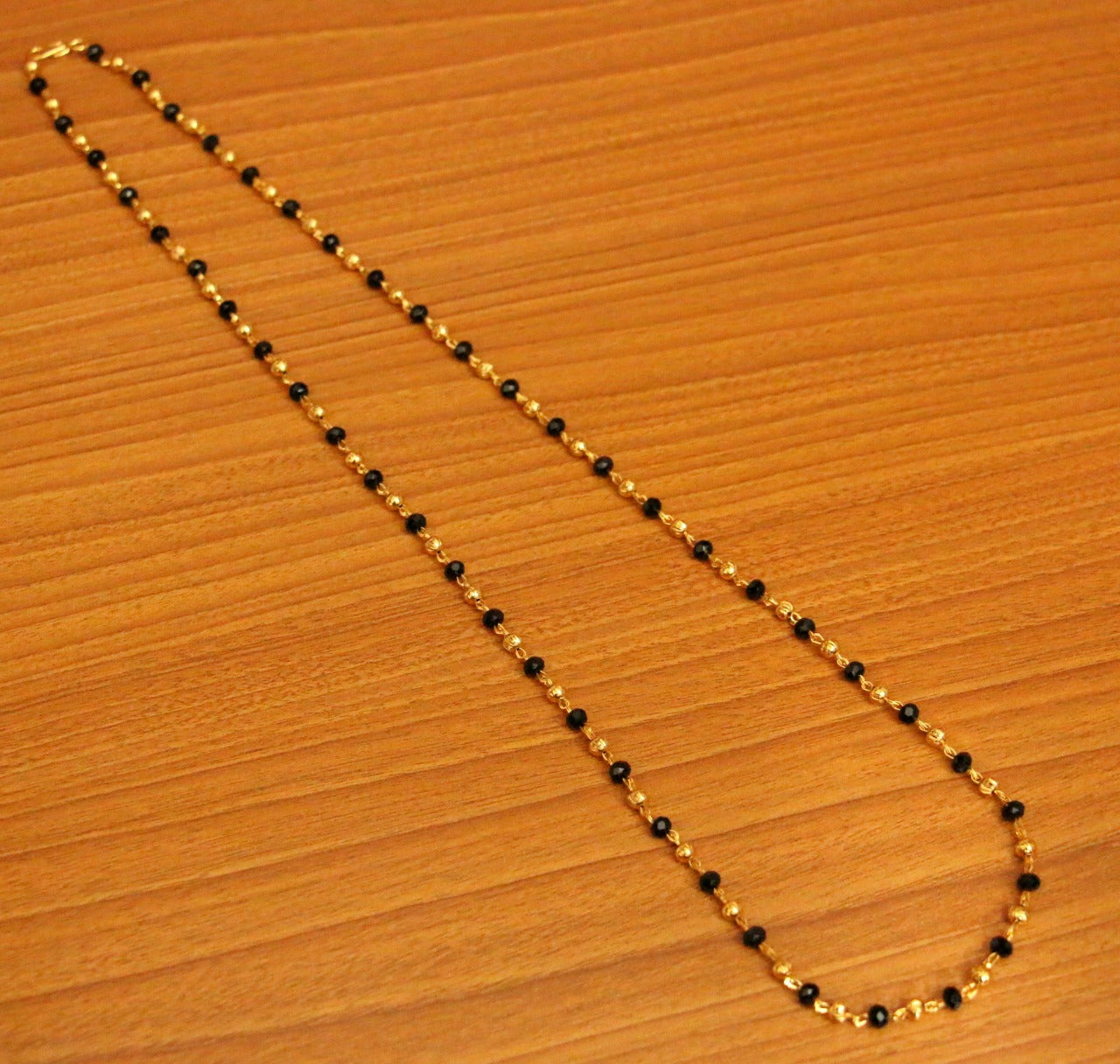 This single line mangalsutra look neck chain is handcrafted in black crystals and golden beads , the necklace is very light in weight and plated with 18kt gold rhodium to give it a real gold look.