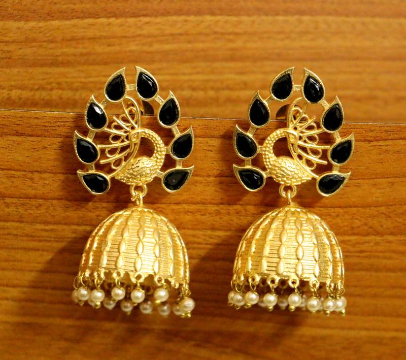 These beautiful peacock looking earrings are handcrafted in copper alloy with imitation black onyx,pearls & polki with matt finishing work of very fine quality. These earrings are coated with 18 kt yellow gold polish which give them a unique look . An absolutely stunning piece to own and are very light in weight.