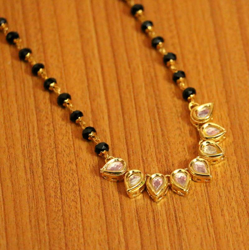 This Magalsutra Is Handcrafted In Copper Alloy With Black Crystal Covered With Gold Plated Caps And Pear Shaped Kundan Of Fine Quality , The Mangalsutra Is Finished With 18kt Fine Nickle Free Gold Plating , The Design Itself Is Very Unique And Very Light In Weight .