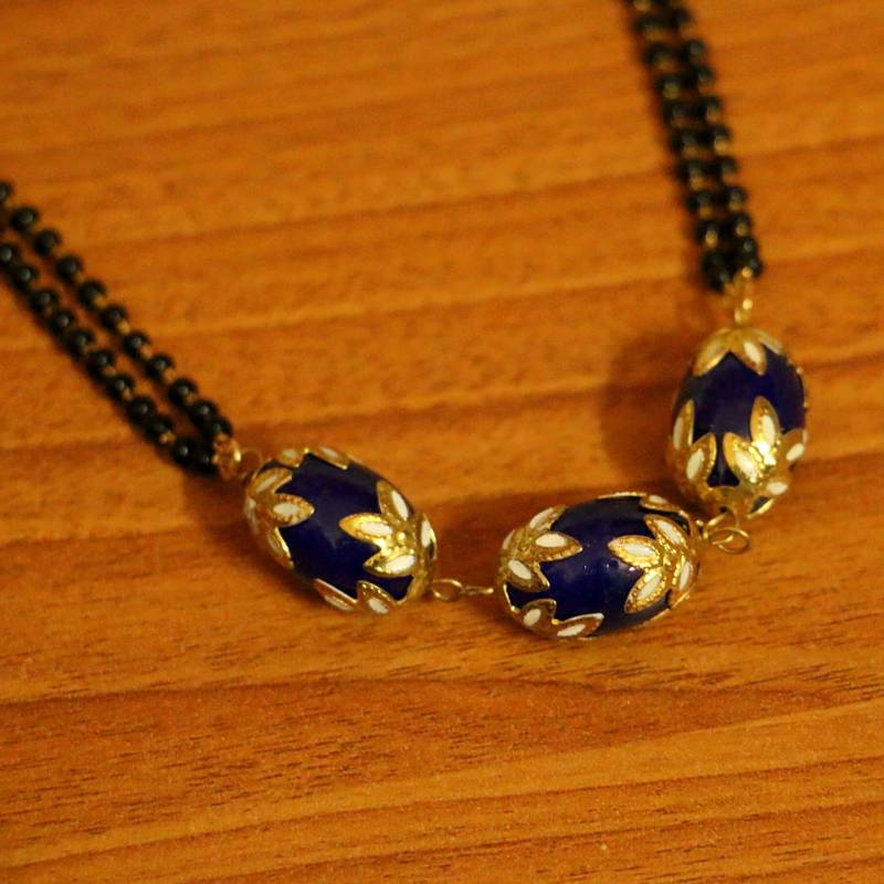 This beautiful mangalsutra is handcrafted in beaded alloy with imitation blue beads with meenakari work of very fine quality . This mangalsutra is coated with 18 kt gold polish which give them a unique look . An absolutely stunning piece to own and are very light in weight.