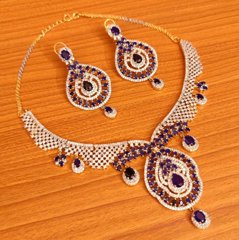 This beautiful necklace set is handcrafted in brass alloy with imitation blue sapphire & semi precious american diamonds work of very fine quality . This necklace set is coated with 18 kt gold polish which give them a unique look . An absolutely stunning piece to own and are very light in weight.