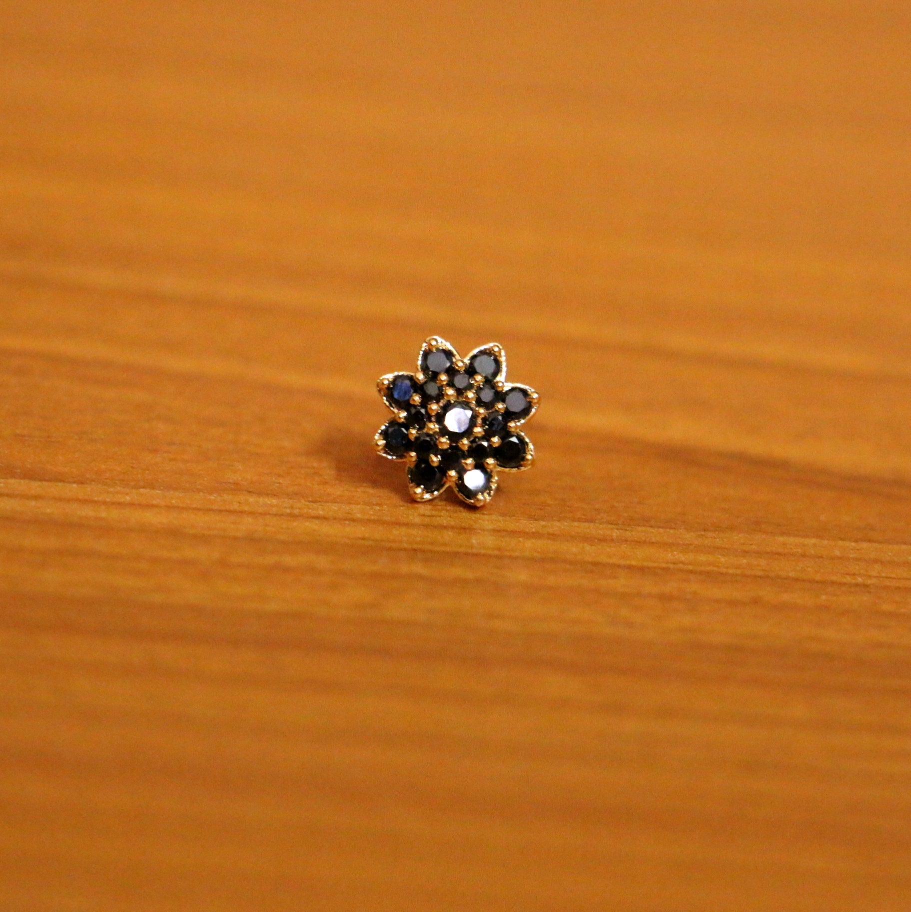 This flower pattern piercing nose ring is handcrafted in silver alloy with imitation dark blue colour cz stones of very fine quality , the nose ring is very light in weight and plated with 18kt gold rhodium to give it a real gold look.