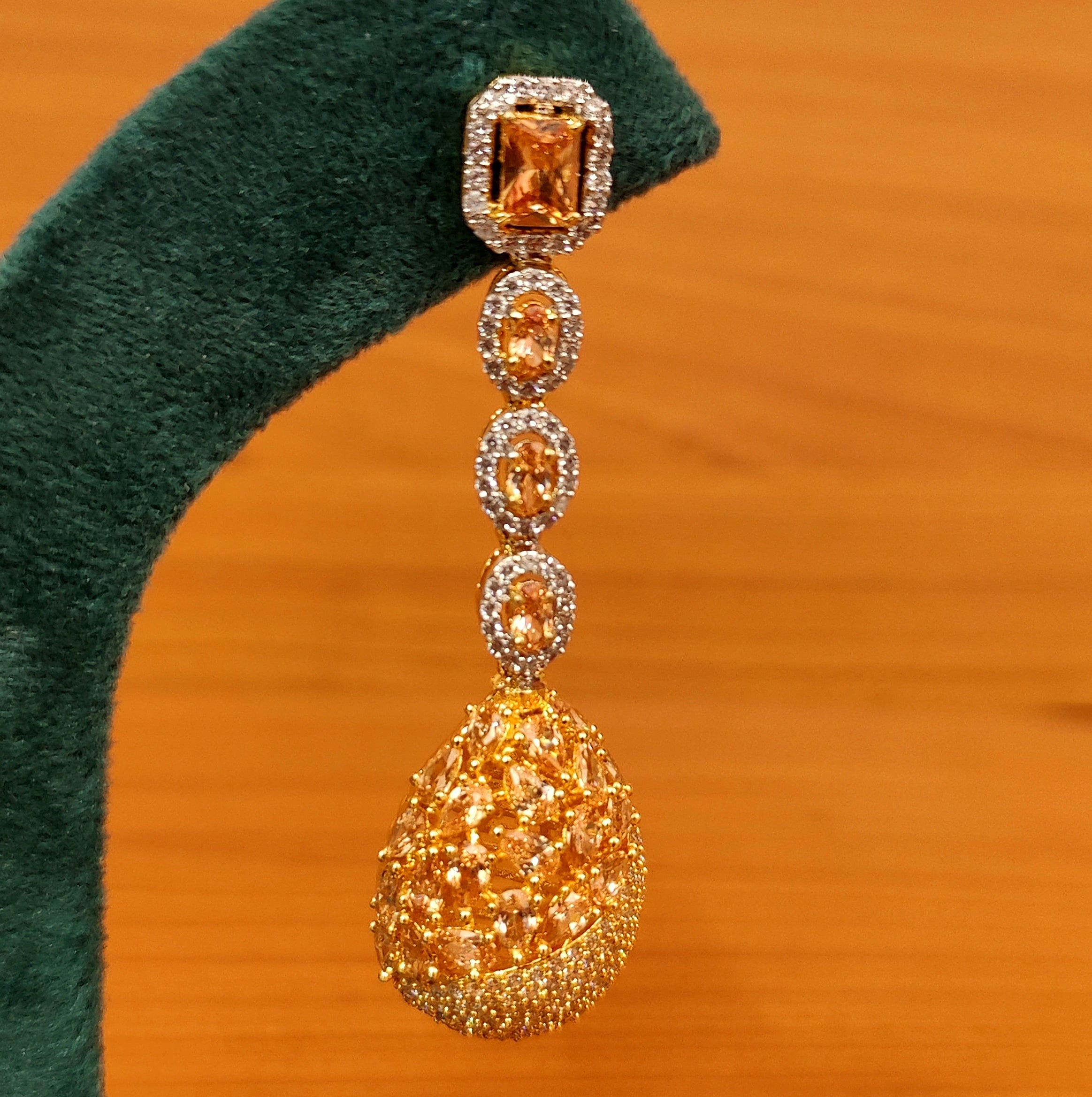 These diamond look earrings are handcrafted in silver alloy with imitation cz signity stones which are of the finest quality of american diamond and citrine colour cz stones. These party wear long earrings are handcrafted to perfection and plated with real 18kt fine nickel free gold rhodium that gives a real diamond look to the design.