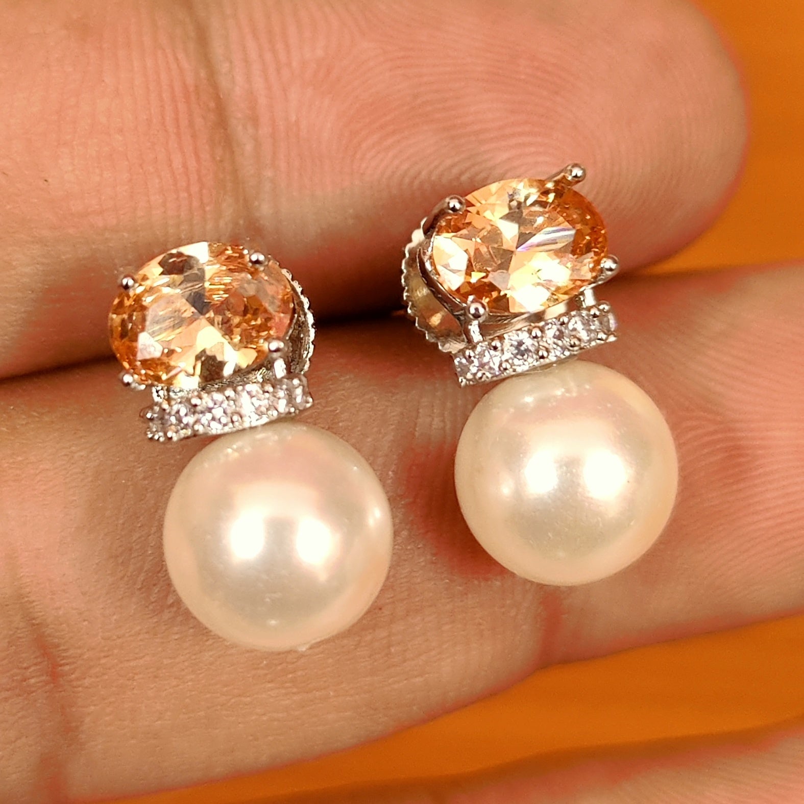 CITRINE STONE SILVER PLATED PEARL STUDS