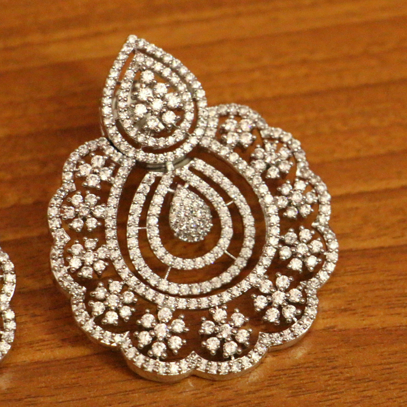 These earrings are handcrafted in silver alloy with imitation american diamond work of very fine quality. These artistic yet modern earrings are plated with high quality white gold rhodium. The earrings are very light in weight.