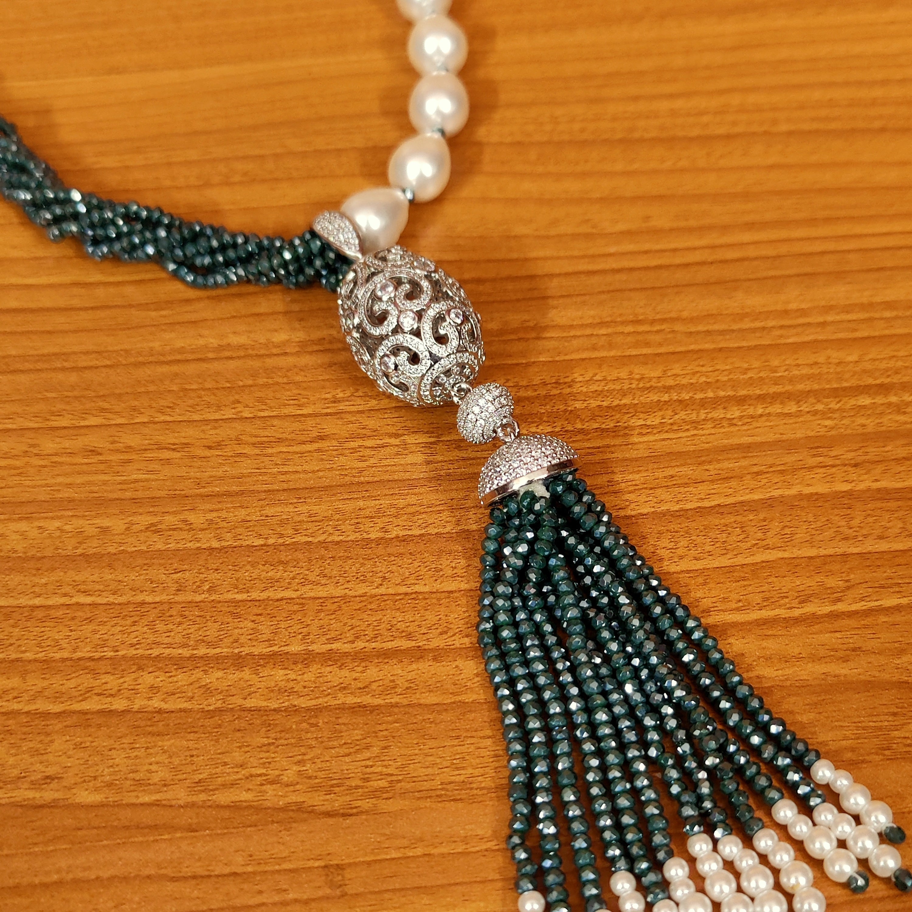 This kundan necklace set is handcrafted in with imitation grey crystal beads, pearls & kundan stones of very fine quality. This gorgeous necklace set is plated with 18kt fine nickle free gold rhodium that gives a unique look to the design. The necklace and the earrings are very light in weight and comes with an adjustable dori.