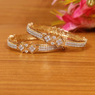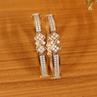 Experience the luxurious look and feel of our handcrafted brass alloy bangles adorned with sparkling cz stones and delicate gold carvings. Each bangle is plated with 18 Kt gold plating, bringing the design to life. This set of 2 bangles exudes pure elegance and sophistication.