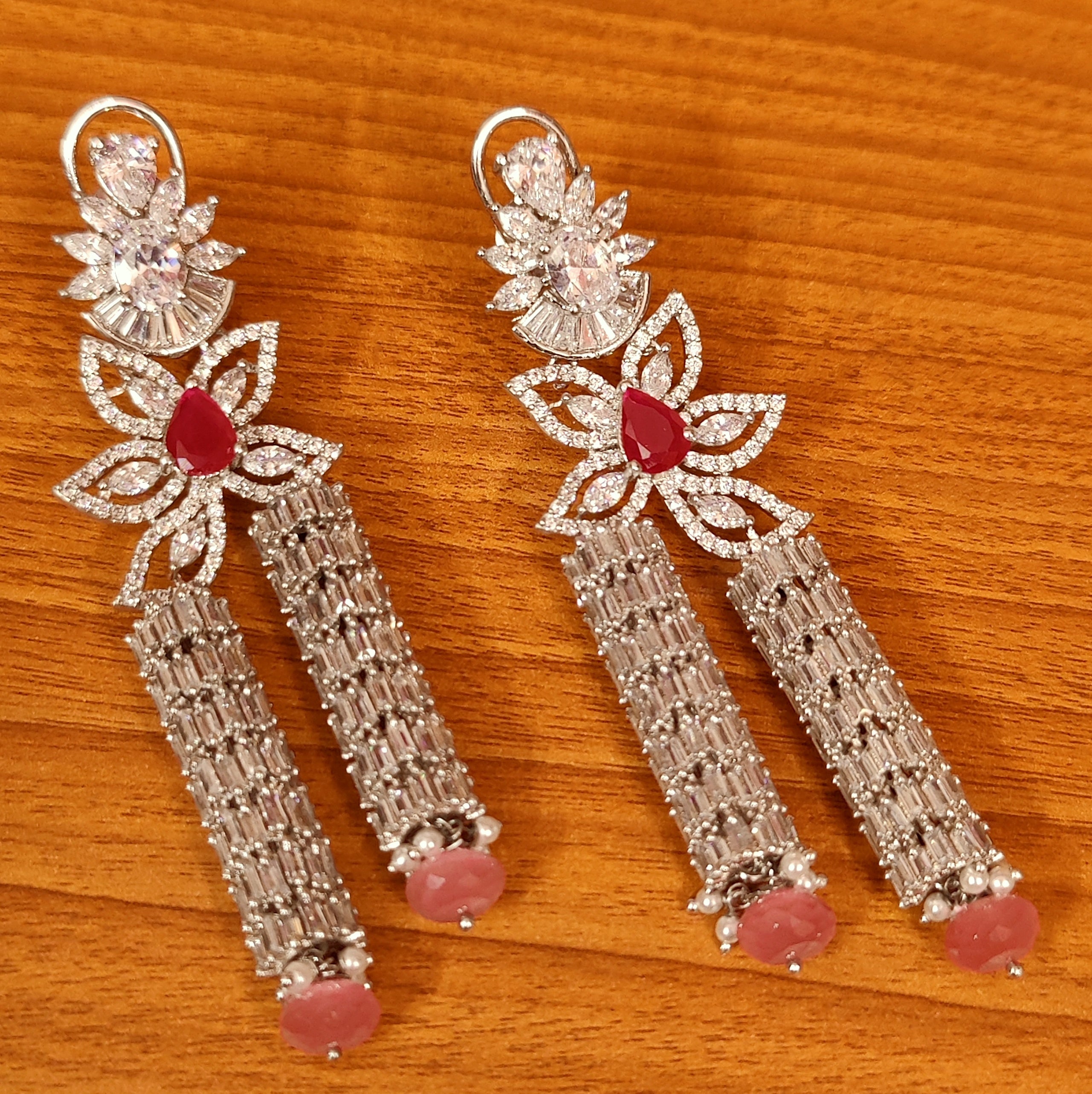 These diamond look ruby danglers are handcrafted in silver alloy with imitation ruby colour and pink colour quartz & baguette shaped cz stones of very fine quality. These gorgeous danglers are handcrafted to perfection with beautifully studded cz stones and plated with 18kt fine nickel free white gold rhodium that gives a real diamond look to the design.