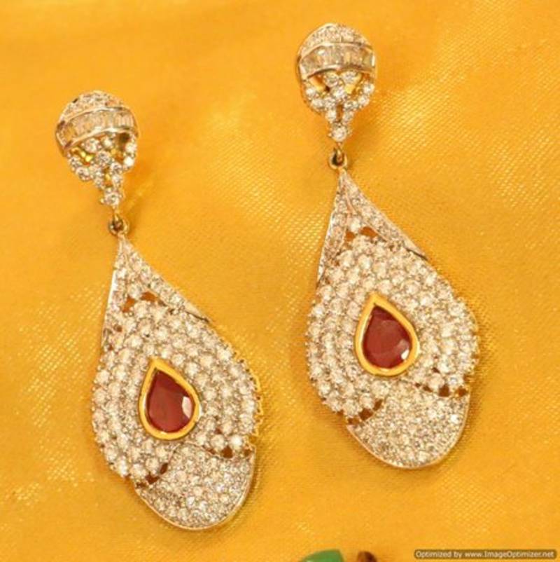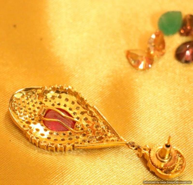 These diamond look danglers are handcrafted in silver alloy with imitation ruby colour quartz & cz stones of very fine quality. These earrings are plated in 18kt gold rhodium plating which gives the design a real jewelry look .