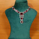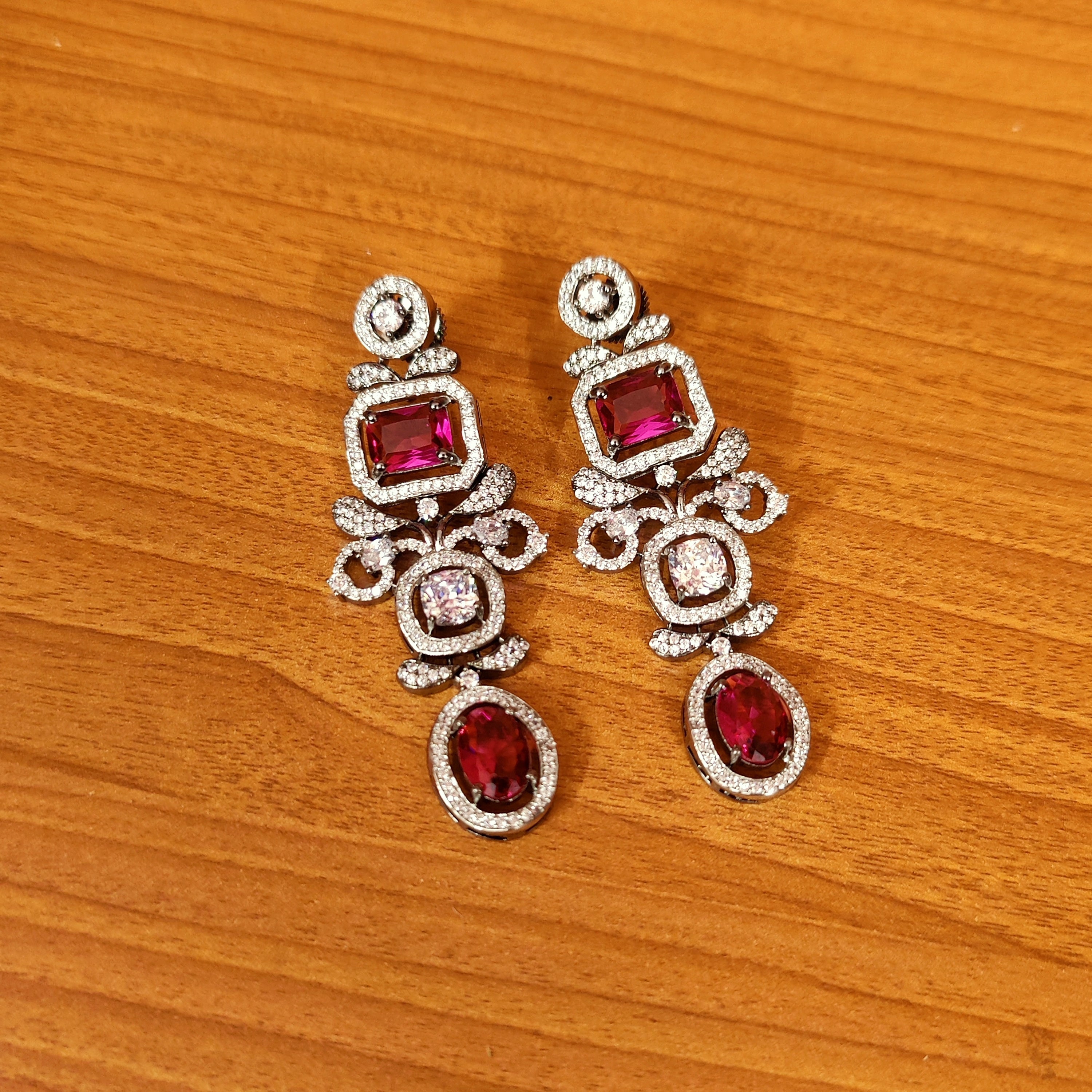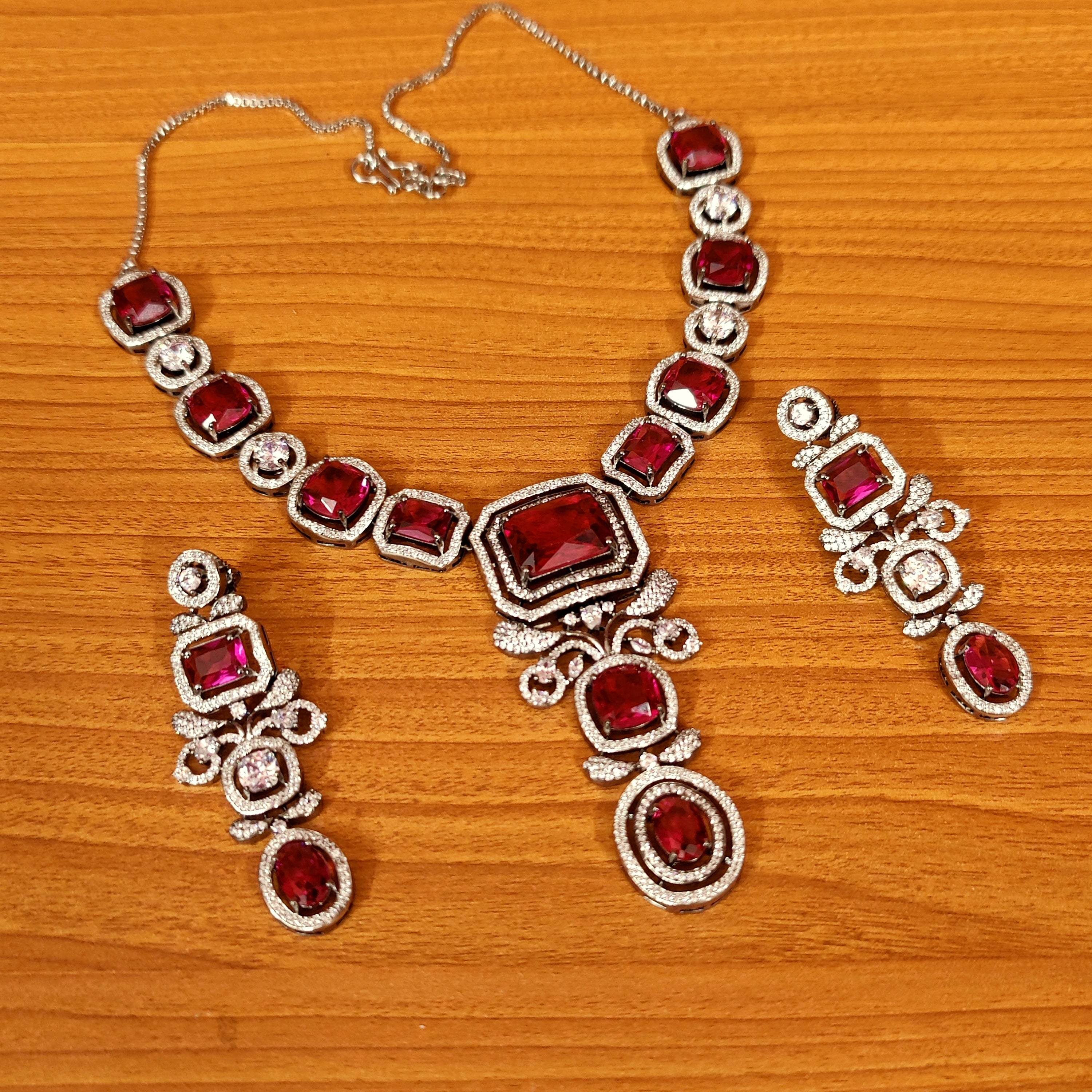 This diamond look necklace set is made in silver & brass alloy with imitation pink cz stones & cz stones of extremely fine quality. This gorgeous necklace set is handcrafted to perfection with superior quality pink colour stones & cz stones and is plated with 18kt nickle free black silver rhodium that gives the design a real diamond look & comes with a matching pair of long size earrings which are absolutely gorgeous and are light in weight.