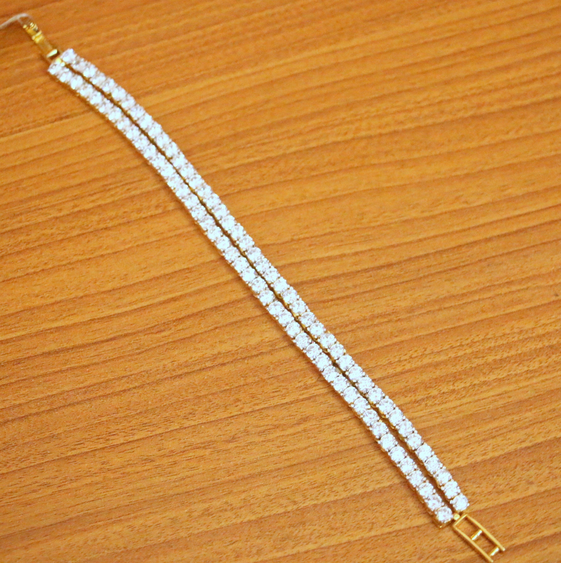 This beautiful two line bracelets is handcrafted in brass alloy with imitation cz stone of very fine quality , the bracelets is plated with 18kt nickle free gold plating which gives it a real look .