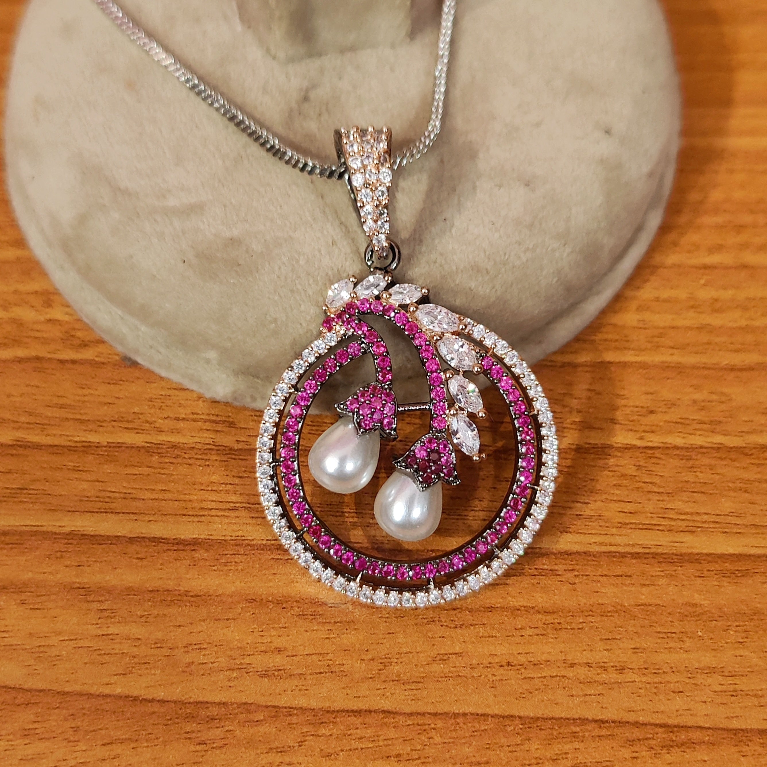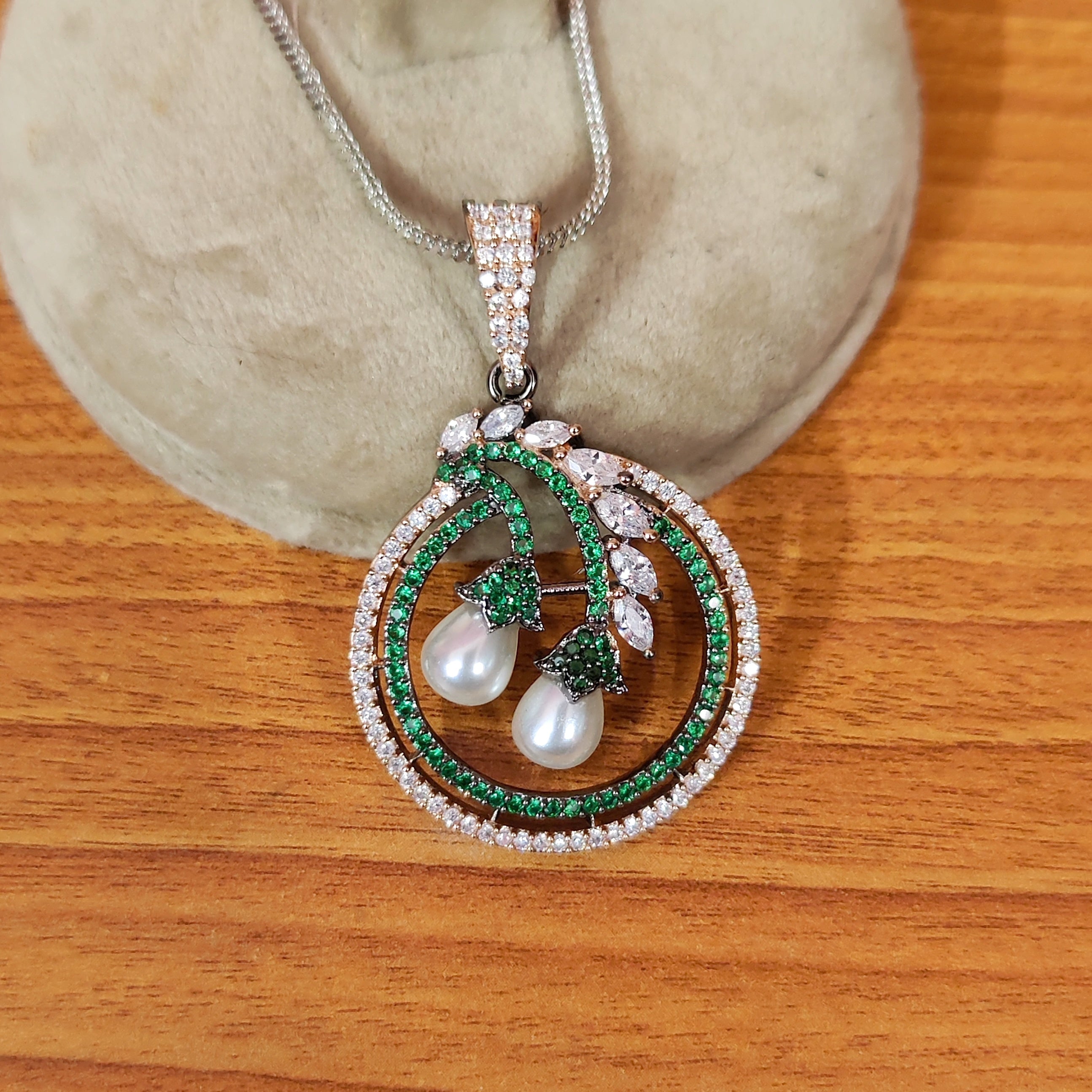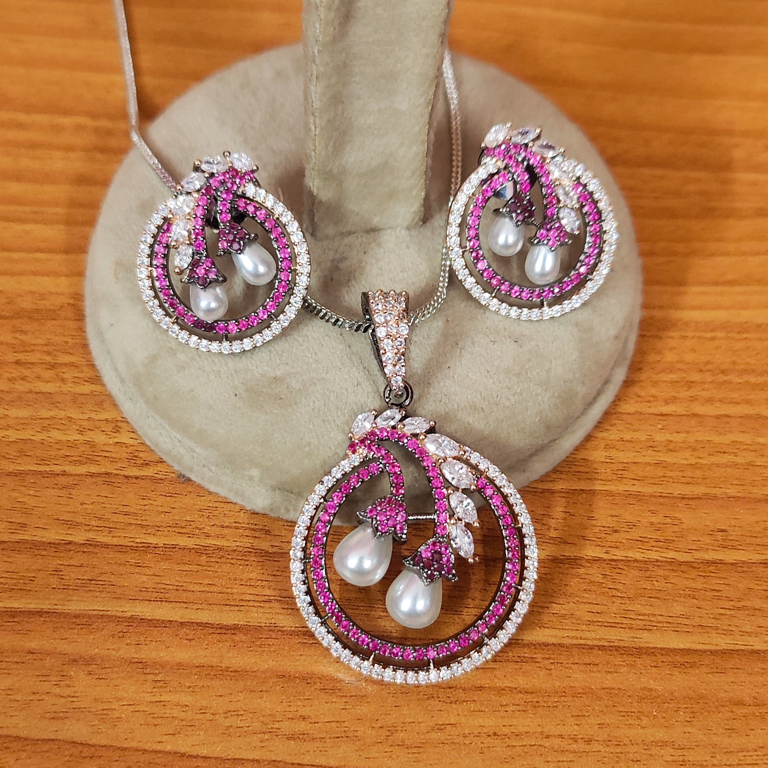 This charming pendant set features a unique combination of pearl stones and sparkling American diamonds on a sleek black rhodium plating. Finely crafted and lightweight, it exudes luxury without breaking the bank. Elevate any outfit with this versatile and elegant set.