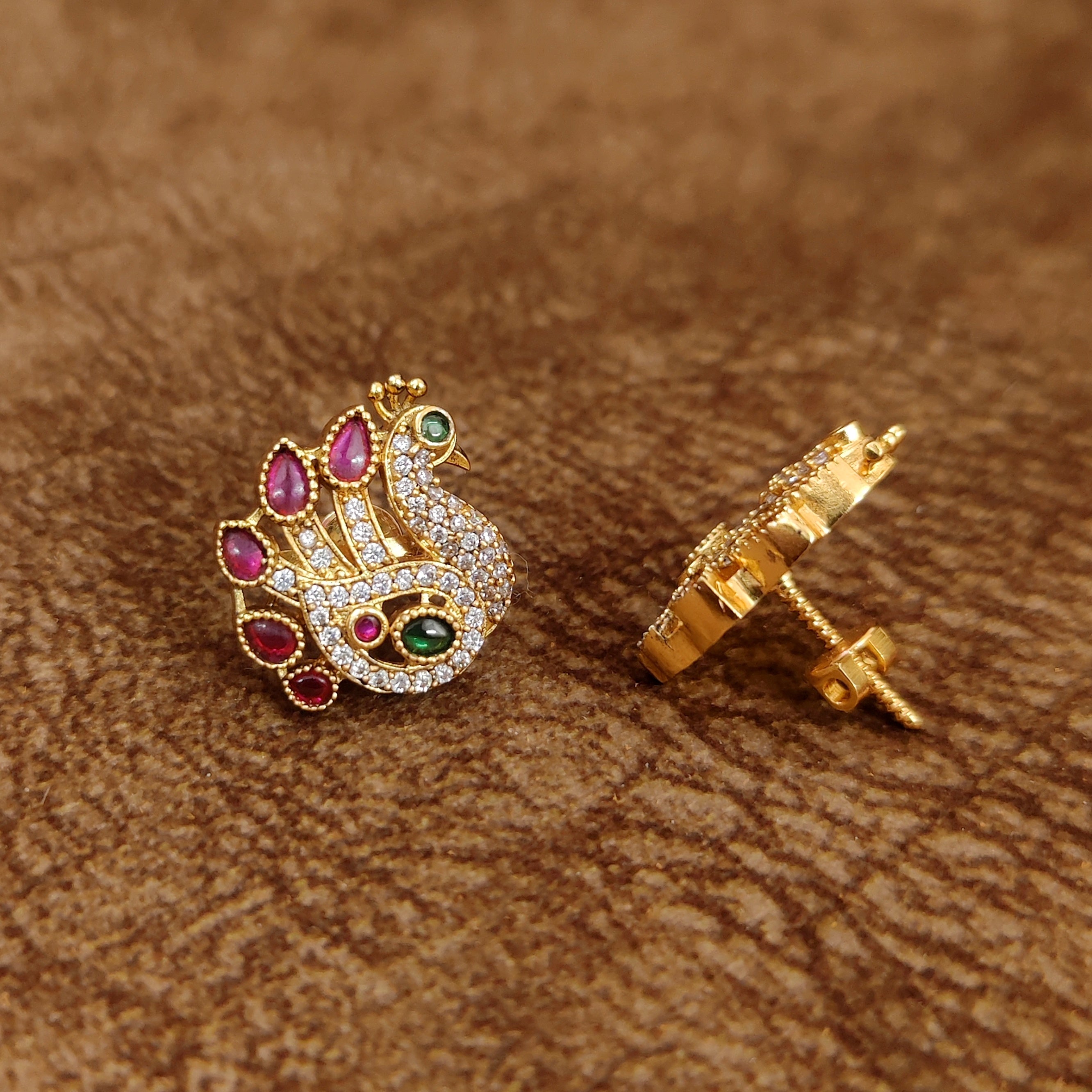 Add a touch of royal elegance to your collection with these Diamond Pattern Multicolour Peacock Screw Back Studs. Inspired by the grace of peacocks, these intricately designed studs feature vibrant Kempu stones in a stunning multicolour arrangement. The gold-plated finish enhances their luxurious appeal, while the diamond-pattern detailing ensures a dazzling look. Designed with a screw-back closure for a secure and comfortable fit, these earrings are perfect for weddings, festive occasions, and traditional celebrations. Shop now and redefine your elegance!