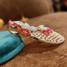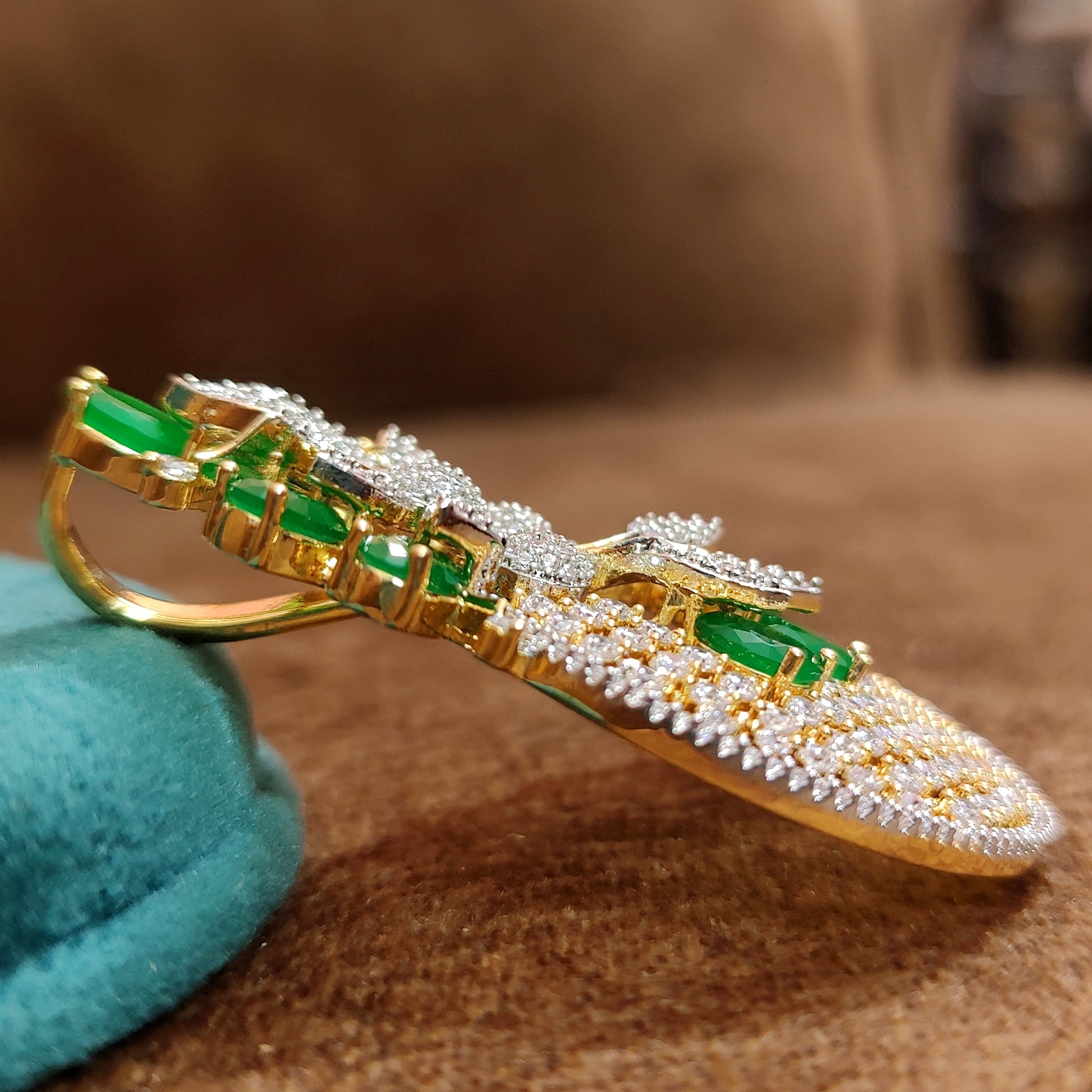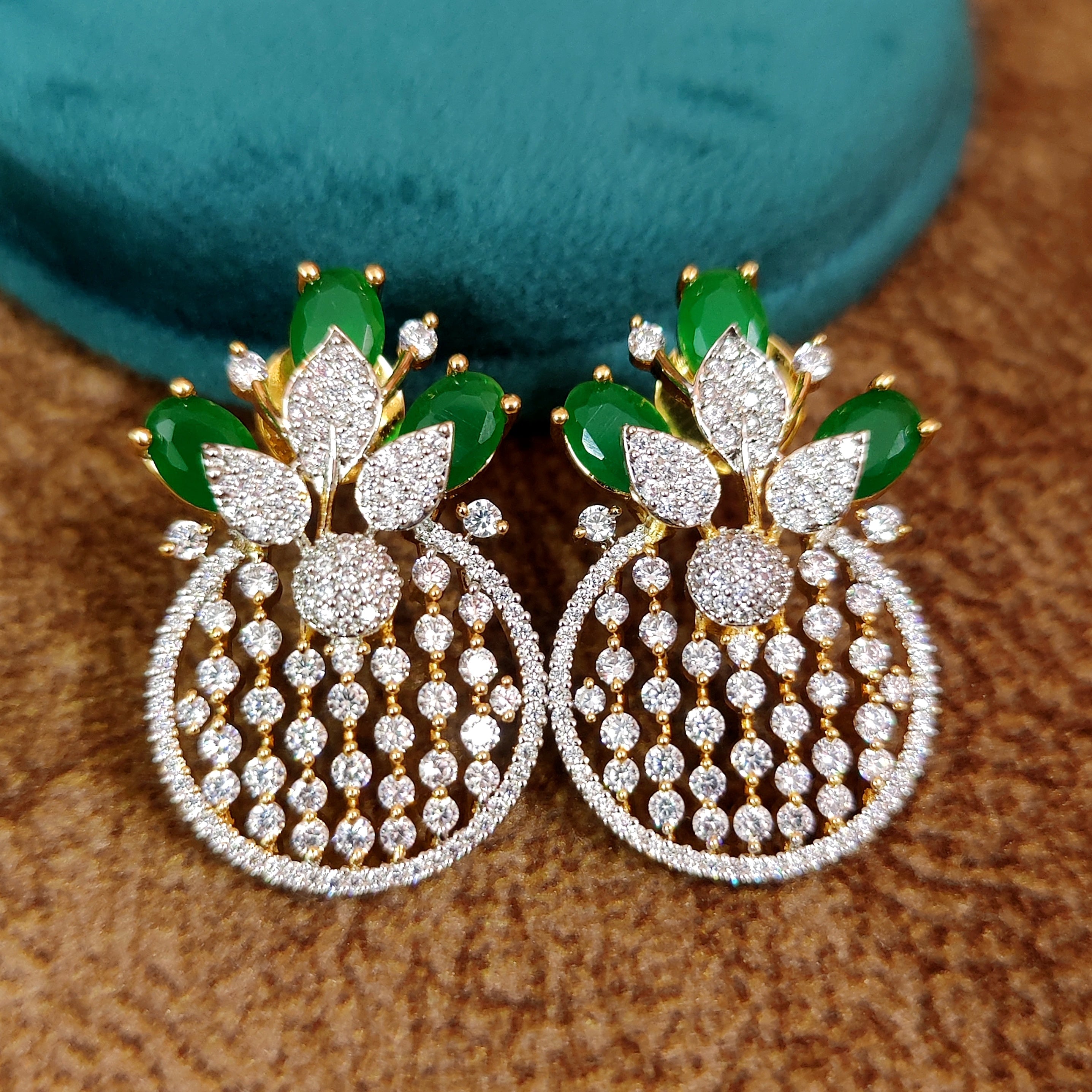 This diamond look pendant set is made in silver alloy with imitation emerald colour green stones and american diamond stones of extremely fine quality. This gorgeous pendant set is handcrafted to perfection with superior quality coloured & cz stones. This pendant set is plated with 18kt nickle free gold & black rhodium that gives the design a real gold look & comes with a matching pair of perfect size earrings which are absolutely gorgeous and are very light in weight.