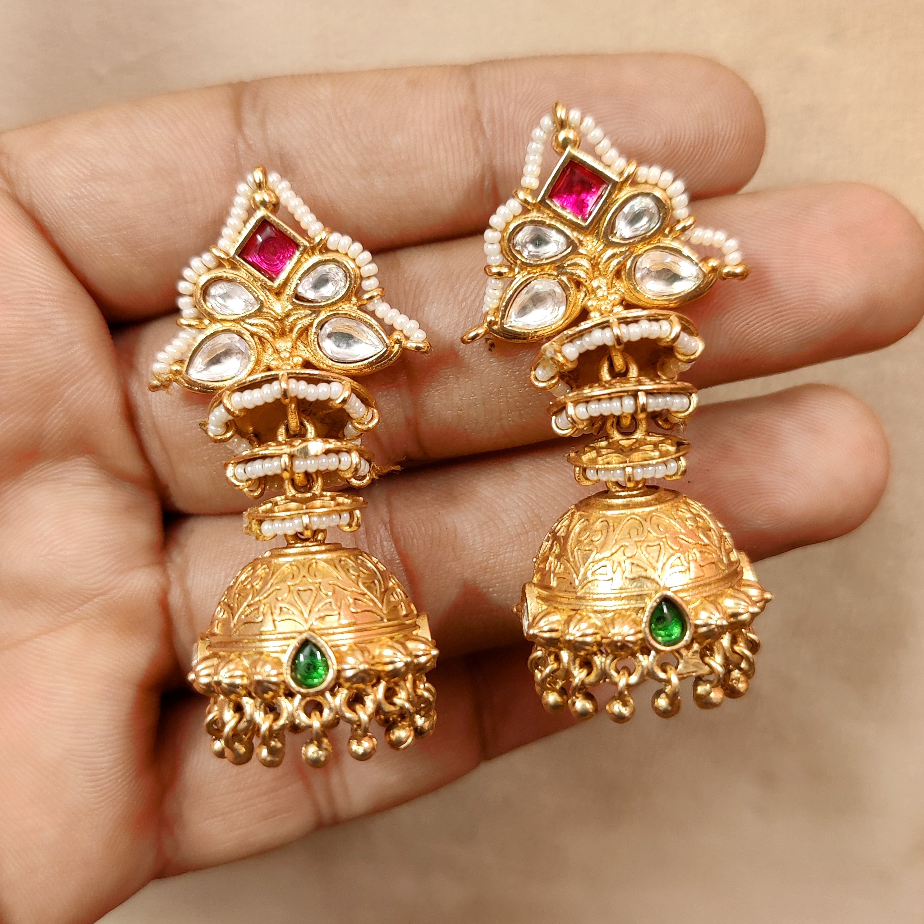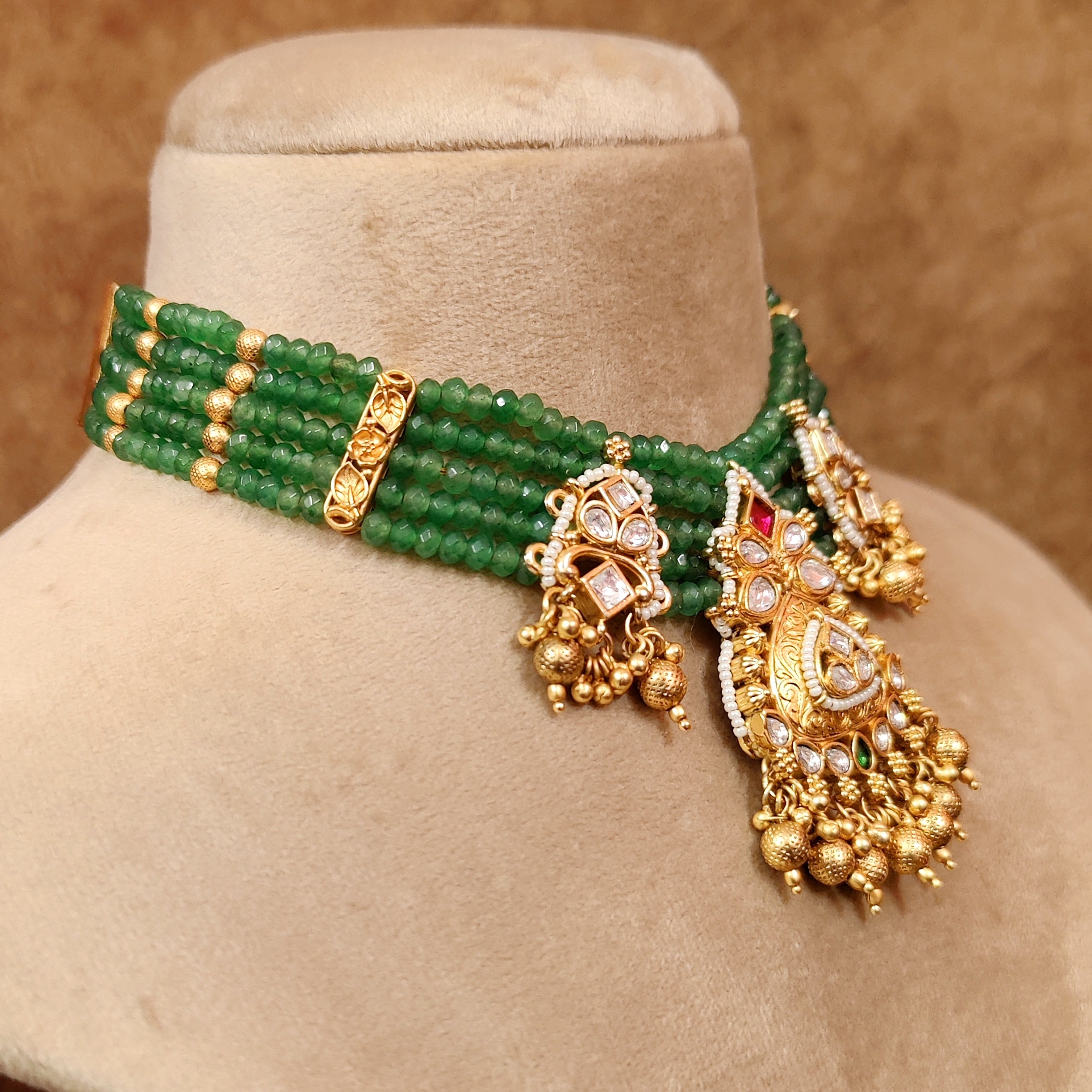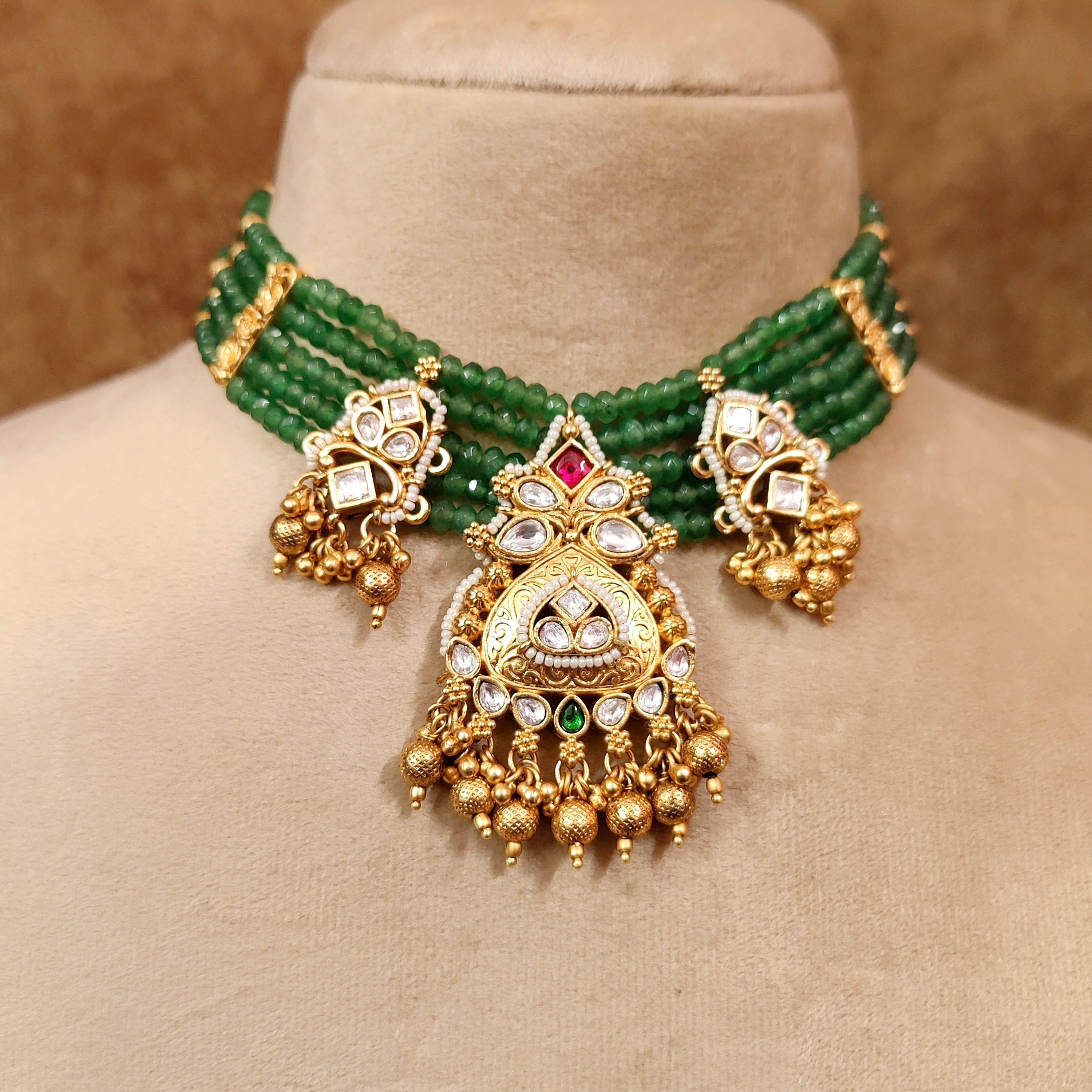 Make a grand impression with the Emerald Look Kundan Polki Wedding Necklace Set from Sanvi Jewels. Featuring striking emerald-colored stones and intricate Kundan Polki craftsmanship, this luxurious set exudes regal elegance. Ideal for weddings, festive events, and grand celebrations, this necklace set offers the perfect fusion of tradition and sophistication, ensuring you shine on your special day.