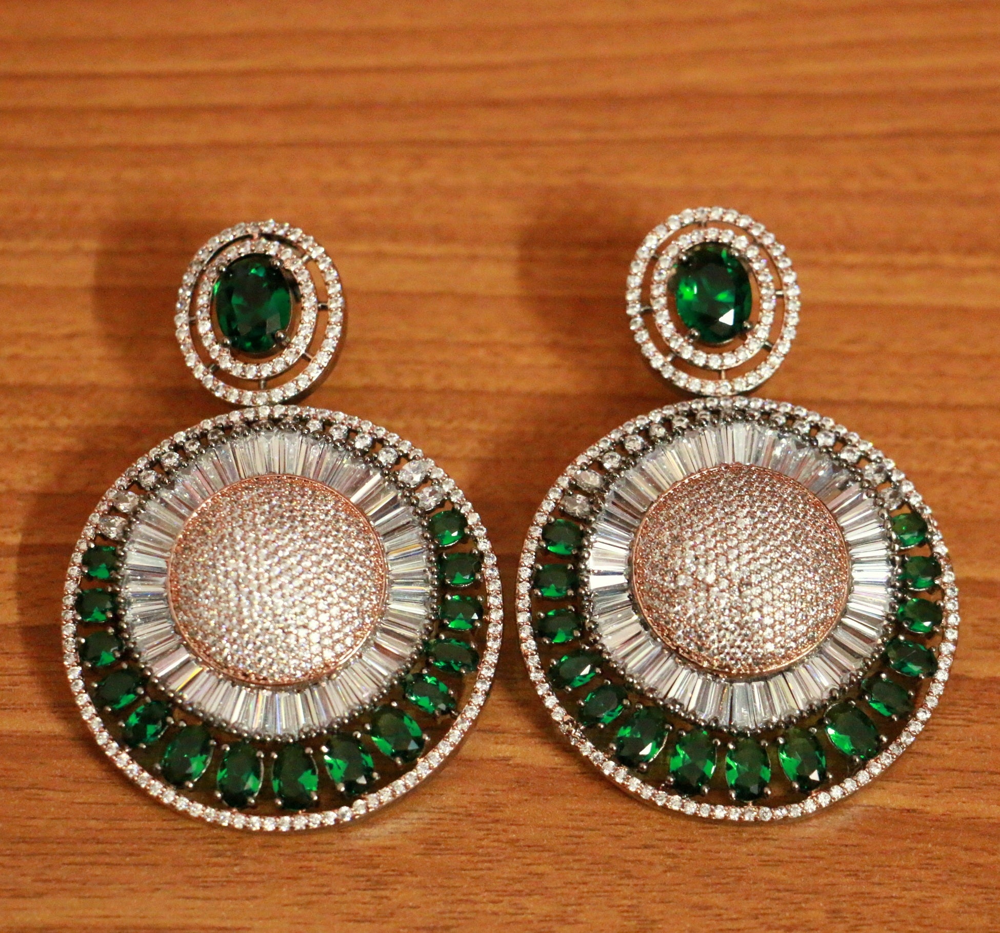 These diamond look danglers are handcrafted in silver alloy with imitation emerald colour quartz & cz stones of very fine quality. These earrings are plated in white gold rhodium plating which gives the design a real jewelry look .