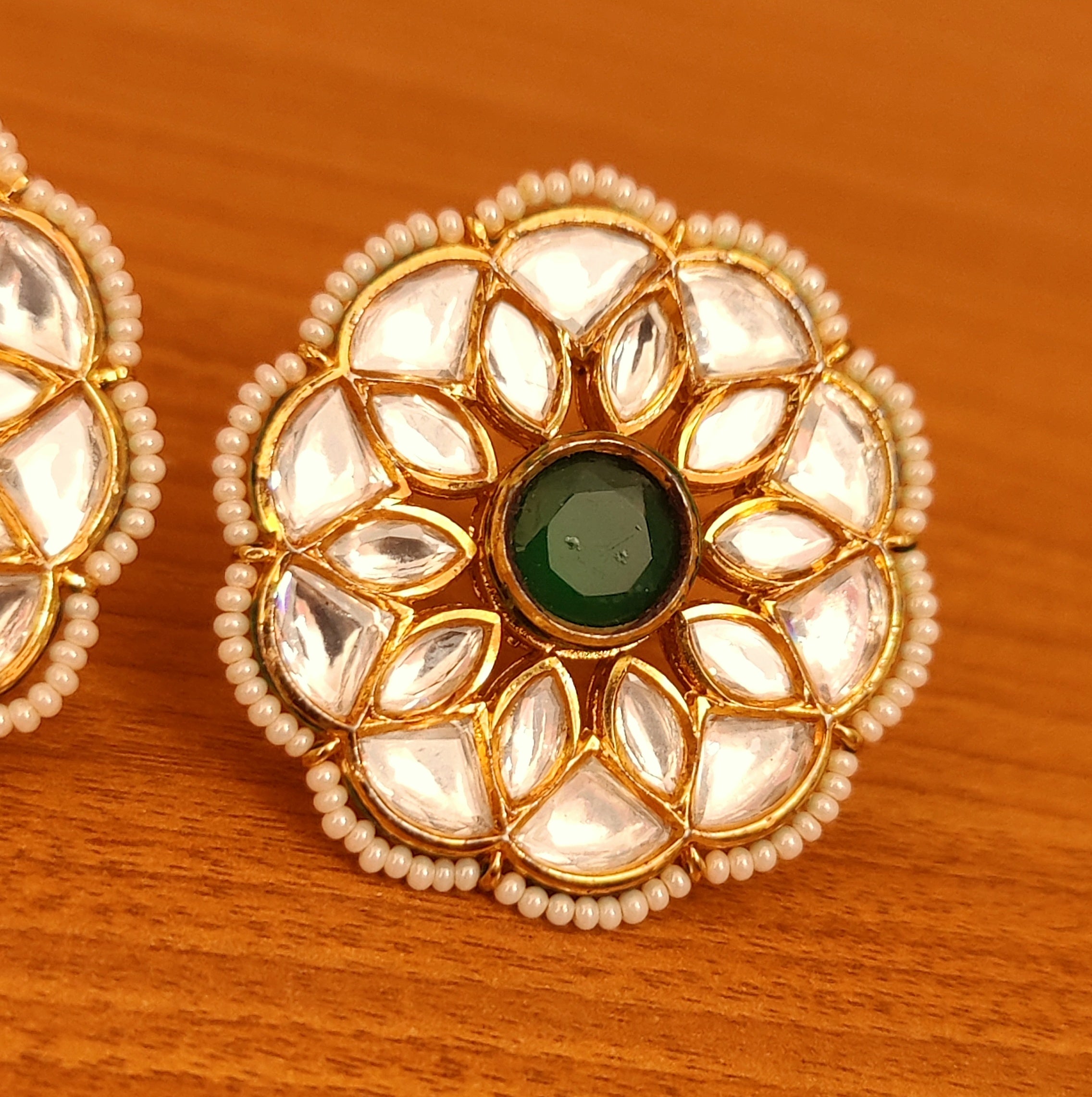 These beautiful big studs are handcrafted in brass alloy with imitation green colour stone & semi precious pearls and kundan work of very fine quality. these artistic yet modern earrings are plated with high quality gold rhodium. the earrings are very light in weight.