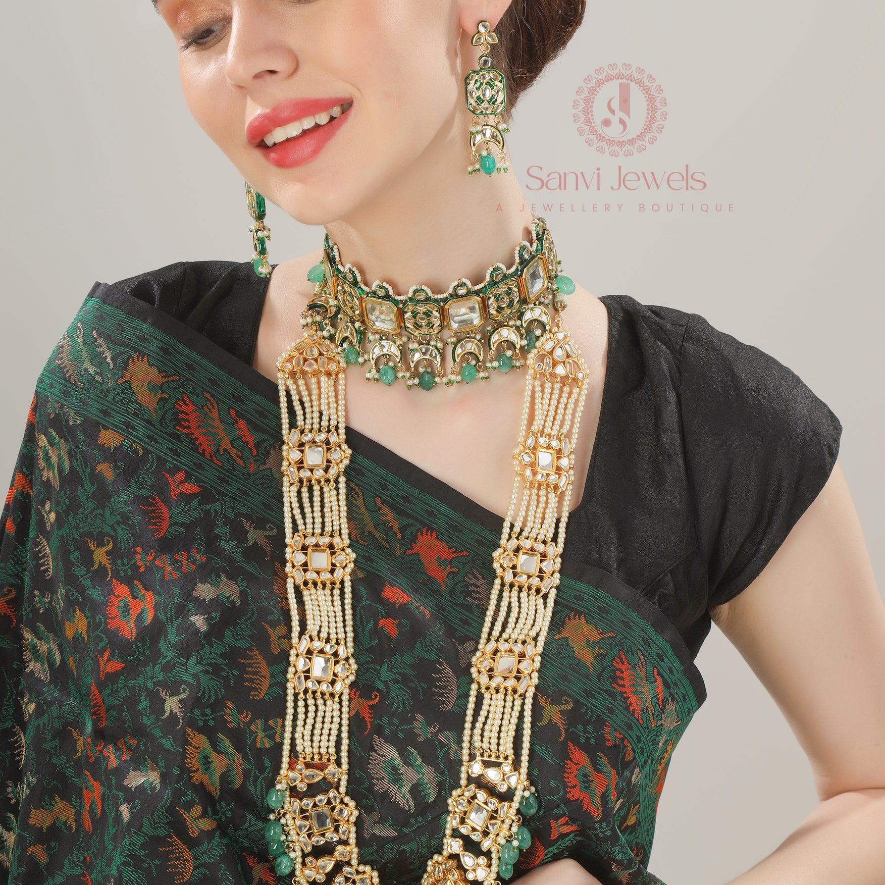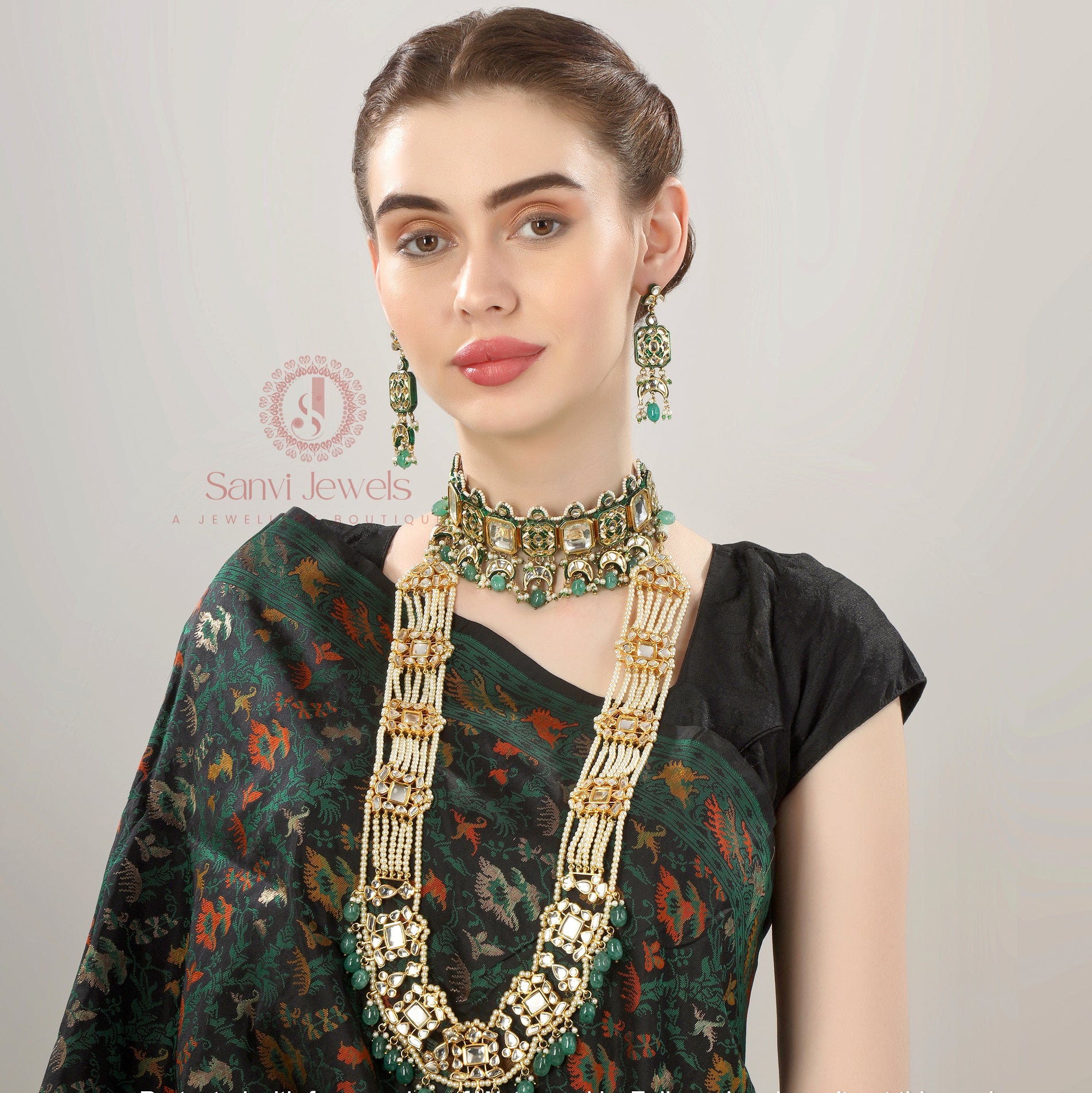 This kundan meenakari choker and long necklace set Is handcrafted in silver alloy with semi precious emerald look quartz stones, pearls and kundan polki stones of very fine quality. This bridal look necklace set is crafted to perfection with fine 18kt nickle free gold plating that gives a real gold look to the design.